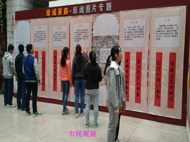 为丰富首府南宁春节文化氛围,活跃群众节日文化生活,为广大市民百姓送上丰盛的节日文化大餐,“同筑中国梦•共度书香年”楹联文化展于1月27日在南宁市图书馆“绿城展廊”开展。此次楹联文化展依托中国传统文化,紧贴百姓迎春习俗,为南宁市民奉上了新春第一道“文化大餐”,受到了广大南宁市民的欢迎。