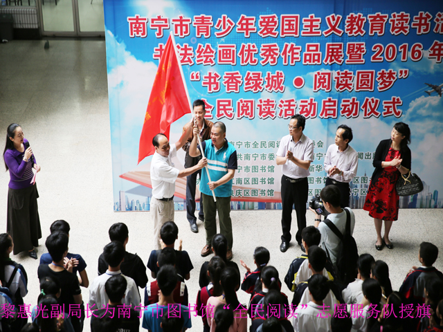 当天活动的议程共有四项内容,首先是“全民阅读”志愿服务队授旗仪式。为深入开展全民阅读活动,南宁市图书馆成立了“全民阅读”志愿服务队,以“奉献南宁市民阅读,共同进步”为宗旨,深入学校、企业、社区、图书流通站等场所开展阅读推广、建设支持、协助管理等志愿服务,走进未成年人、农民工、老年人、残疾人等群体开展阅读关爱活动,并为读书节、讲座、读书沙龙等大型活动提供协助组织、管理服务。南宁市文化新闻出版广电局黎惠光副局长在活动中向南宁市图书馆“全民阅读”志愿服务队进行授旗,并对该志愿服务队给予厚望,南宁市图书馆陆庆副馆长接受队旗。