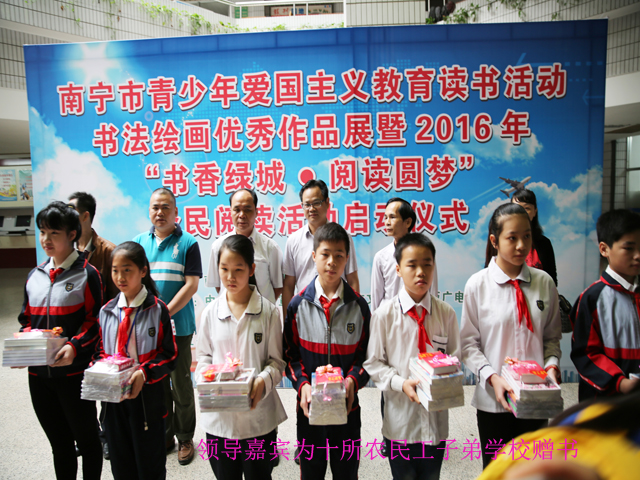 在第二项活动内容里,南宁市委宣传部副部长李德山、南宁市新华书店副总经理孙大越、南宁市文化新闻出版广电局副局长黎惠光、南宁市图书馆党支部副书记廖集光向农民工子弟学生代表赠送经典书籍。为了让外来务工子女同样享有阅读的乐趣,南宁市委宣传部、南宁市新华书店精心挑选了一批经典书籍赠送给农民工子弟学生代表,希望孩子们能够用心读书,从书中汲取进步的营养,养成阅读的好习惯。这些可爱的孩子们分别来自南宁市青秀区振兴小学,南宁市青秀区蓉茉小学,南宁市兴宁区崇尚小学,南宁市兴宁区西南华侨小学,南宁市江南区海飞小学,南宁市江南区江南小学,南宁市良庆区大联小学,南宁市良庆区玉洞小学,南宁市西乡塘区红阳小学,南宁市西乡塘区新南小学。