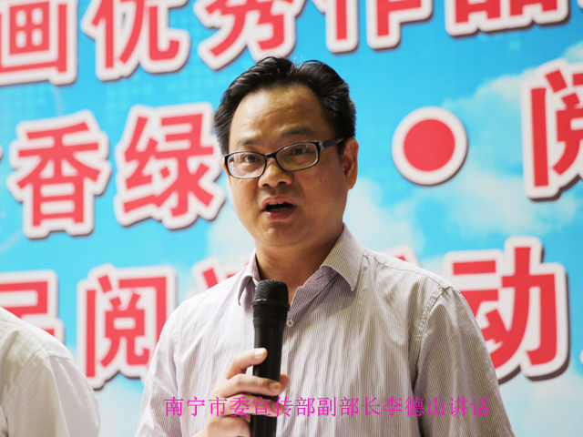 书籍是人类进步的阶梯,读书使人进步,读书使人智慧,读书催人奋进。在宣读全民阅读倡议书这一环节,南宁市委宣传部李德山副部长进行了热情洋溢的讲话,他说:一个国家是否有广泛的大众阅读,是否有乐于读书的社会风尚,决定了人们能否主动吸收各种文化的营养,在潜移默化的滋养中,提升国民素质,营造文明氛围,引领先进文化。多年来,南宁市积极响应中央、自治区号召,持续开展了一系列“书香绿城”全民阅读活动,为提高全民思想道德素质和科学文化素养、构筑文化南宁起到了积极的促进作用。推进全民阅读是一项长期任务,任重而道远;同时,他向全市人民发出倡议:一、每一位市民都行动起来,放下手机拿起书,让我们与书为友,热爱阅读,每天阅读一小时,每月阅读一本书,让读书成为一种习惯。二、每一个家庭都行动起来,从亲子共读、夫妻同读入手,多带孩子去图书馆、书店,每天和孩子共享阅读好时光,培养良好的家庭阅读习惯,建设书香家庭。三、每一个单位都行动起来,通过举办读书讲座、读书研讨会、征文比赛等多种形式,吸引干部职工参与读书活动,积极创建“书香机关”、“书香校园”、“书香企业”、“书香村镇”、“书香社区”,使阅读学习蔚然成风。