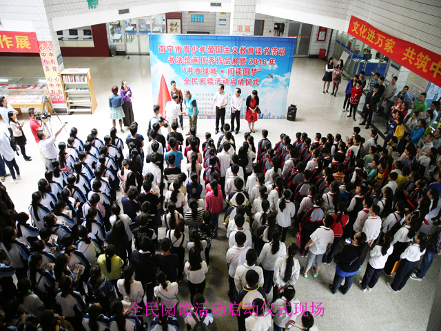 今年是中宣部、国家新闻出版广电总局等部门倡导和开展全民阅读活动的第10个年头。根据中央办公厅《关于培育和践行社会主义核心价值观的意见》精神,按照广西全民读书活动组委会和自治区党委宣传部有关通知要求,为持续深化我市全民阅读活动,推进创建学习型社会,南宁市将在全市开展2016年“书香绿城•阅读圆梦”全民阅读活动。4月23日,由南宁市全民阅读活动组委会主办,中共南宁市委宣传部、南宁市文化新闻出版广电局、南宁市图书馆、南宁市新华书店承办,特别推出南宁市青少年爱国主义教育读书活动书法绘画优秀作品展暨2016年“书香绿城•阅读圆梦”全民阅读活动启动仪式。