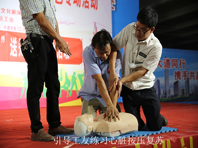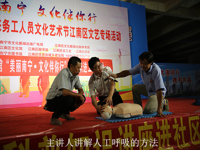 当天的活动,不仅南宁市图书馆汽车图书馆开进了江南万达建设工地,“绿城讲坛”还为广大外来务工朋友们邀请到了南宁市急救医疗中心培训科邓双昌副科长带来“工地安全与急救知识”专题讲座。主讲人邓双昌结合案例为工友们分析了日常工作中工地常见的几种危害个人人身安全的事故,如触电、高空坠物、碰撞等,然后针对不同状况为工友们详细讲授了如何做有效的临时处理,以便争取宝贵时间,为医护人员的救护创造条件。在演示如何救治呼吸暂停、脉搏停止受伤人员时,主讲人还讲解了人工呼吸、心脏按压复苏的正确手法,再通过邓双昌副科长的同步讲解,使工友们非常直观的学习了急救方法。理论还需结合实践,一位刘姓工友也上台在两位老师的指导下进行操作,通过这个方式,老师们又将几个重要事项进行了强调,加深大家的印象。邓双昌老师说:“在面对突发情况的时候,掌握急救知识就是在和时间赛跑,对于伤者来说,每一分每一秒都是格外的珍贵。”