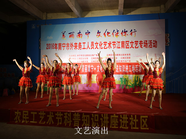 自2016年南宁市外来务工人员文化艺术节启动以来,全市丰富多彩的主题活动火热开展,为广大进城务工人员送上了丰盛文化大餐。5月31日晚,由市文化新闻出版广电局主办,南宁市图书馆、江南区文化新闻出版体育局等单位承办的“美丽南宁•文化伴你行”2016年南宁市外来务工人员文化艺术节文艺专场活动在江南万达项目建设工地举行,受到了外来务工人员的欢迎。
