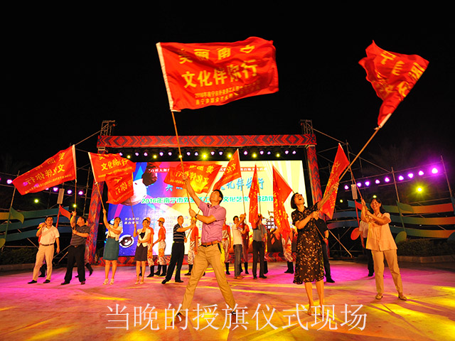 除了为广大外来务工朋友提供的图书流动服务,启动仪式上还有精彩纷呈的歌舞表演在民歌湖水上舞台上盛典炫动,南宁市图书馆蒋桂香副馆长在活动期间接受了“美丽南宁•文化伴你行”——2016年南宁市外来务工人员文化艺术节南宁市图书馆服务小分队的旗帜。