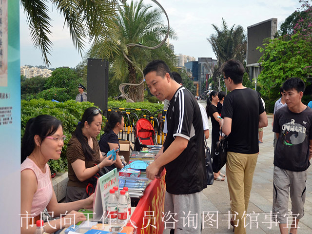 继当天上午启动“2016年公共图书馆服务宣传周”活动之后,刚刚走出中建交通集团广西分公司的“南宁东西快速路1标”项目部,为该部奋斗在建筑工地上的外来务工人员送上文化大餐的南宁市图书馆,紧接着又在民歌湖广场为绿城广大的外来务工人员开展了一系列文化活动。在南宁市图书馆学会的积极组织下,南宁市图书馆、南宁市少年儿童图书馆在广场同步进行了现场办理借书证、中华传统文化挂图展、桂版图书阅读推广展以及有奖知识竞答等内容丰富、形式多样的文化活动,吸引了现场众多外来务工人员和广大市民的踊跃参与。作为奖品,南宁市图书馆提供的牙膏、香皂、面巾纸、洗衣粉等生活用品深受现场群众欢迎。南宁市图书馆服务指南、24小时自助图书馆等宣传折页也备受青睐,大家都觉得图书馆离自己越来越近了,只要想看书,随时都能光顾图书馆这样的文化阵地非常方便,尤其是现在,各种各样的阅读推广活动都走进了社区、走进了工地,走进了企业,走进了学校,甚至走进了田间地头,人性化的图书馆服务令大家受益颇多。