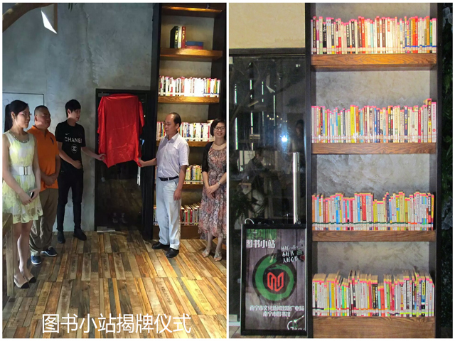 6月3日下午,南宁市图书馆第三家“图书小站”在位于民族古城路口的聚网咖古城店揭牌。市文新广局副局长黎惠光、公共文化科科长谢榭,市图书馆副馆长陆庆、蒋桂香等领导参加了揭牌仪式。当日南宁市图书馆将200册图书搬到这里上架,加上之前分别位于凤翔路聚网咖蓝山店的400本和明秀西路聚网咖正恒店的200本,总共有800本新潮而时尚的图书每天吸引着“网虫”们前来阅读。