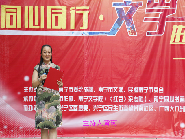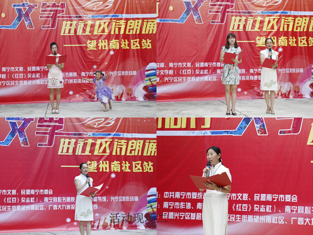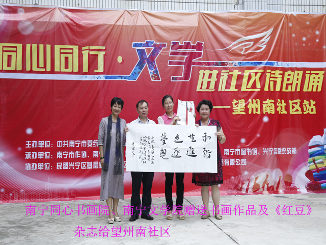 “同心同行•文学进社区”活动由中共南宁市委统战部、民盟南宁市委会、南宁市文联主办,南宁文学院(《红豆》杂志社)、南宁市作协、南宁同心书画院、南宁市图书馆与南宁市各社区携手承办。旨在以诗朗诵的主要形式,让诗人、艺术家与社区居民零距离接触,在丰富绿城社区群众的文化生活的同时,也在南宁的热土播洒下文学的种子。