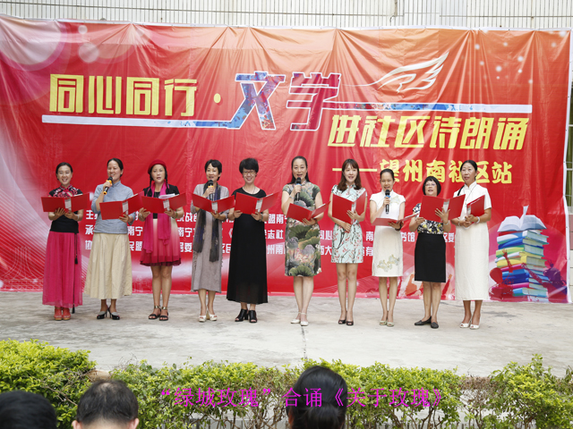 “绿城玫瑰”的集体登台朗诵是本站活动的特色。农秀红、四丫头、覃咏梅、李雪、黄莉莉、宋女、谢蓉、秋枫、覃秋林、黄珂等女作家轮番登台,献上自己的原创诗作,展现了绿城女作家们饱满的热情,优雅的气质和过人的才气。而她们深情并茂的朗诵,也唤起了社区群众心中的诗意。最后,诗朗诵活动在全体玫瑰作家深情献上的、由玫瑰“村长”丘晓兰原创的《关于玫瑰》的朗诵中,完美落下帷幕。