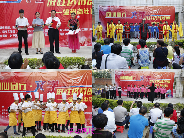 “同心同行”是“文学进社区”活动的又一主题。中共南宁市委统战部以“同心”思想为引领,以统战文化建设为抓手,创新性地开展了多种活动。成立于2001年的望州南社区,曾获“全国和谐邻里建设示范社区”等百余项荣誉称号。正如本站活动的主题诗《望州南社区》中所言,这个团结、和谐的社区“以诚为务有合力,万众同心得净观。”活动中,望州南社区组织的合唱《能帮就帮》、诗朗诵《满江红》、集体舞《烹饪进行曲》这几个接地气的节目与诗朗诵交相辉映,也活跃了现场的气氛。