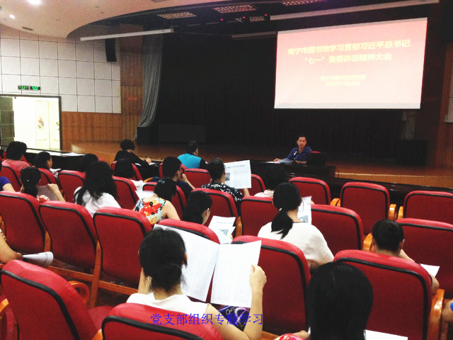 习总书记的重要讲话,为我们指明了新形势下加强理想信念教育的前进方向,坚定了每一个党员干部的理想信念。7月15日,在南宁市图书馆多功能厅,由党委副书记廖集光同志带领支部全体党员对习总书记的“七一”重要讲话精神进行了系统的学习。