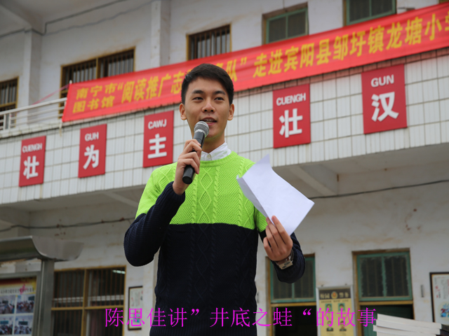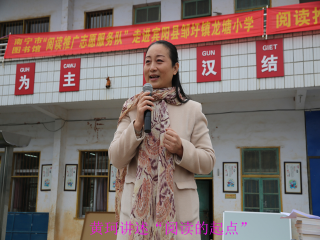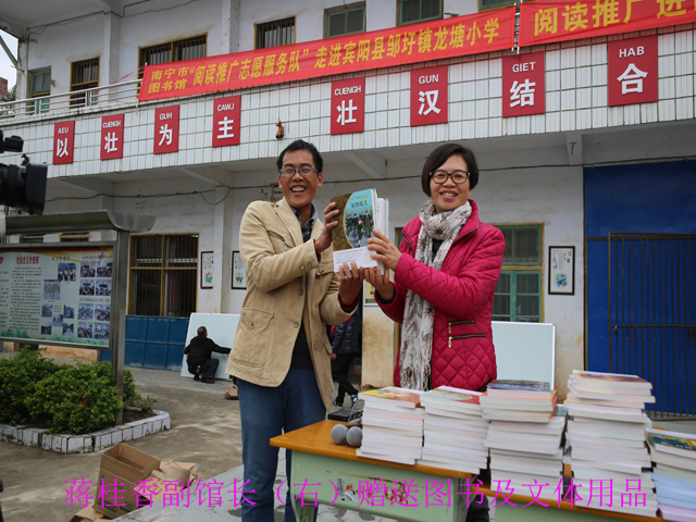 2016年12月14日,南宁市图书馆“阅读推广志愿服务队”前往宾阳县邹圩镇龙塘小学开展文化扶贫、阅读推广活动,并将一批少儿课外读物和文体用品赠与该校,受到师生们的热烈欢迎。