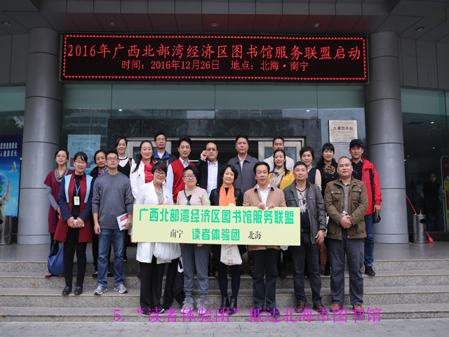 2016年12月26日,早上7点,晨曦微露,整个城市刚刚苏醒,星光大道6号南宁市图书馆的24小时自助图书馆透着温暖的光。广西北部湾经济区图书馆服务联盟在此正式启动,由20名南宁市联合图书馆的持证读者组成的“读者体验团”从南宁出发前往北海,体验南宁—北海两地图书馆借阅一卡通的功能。