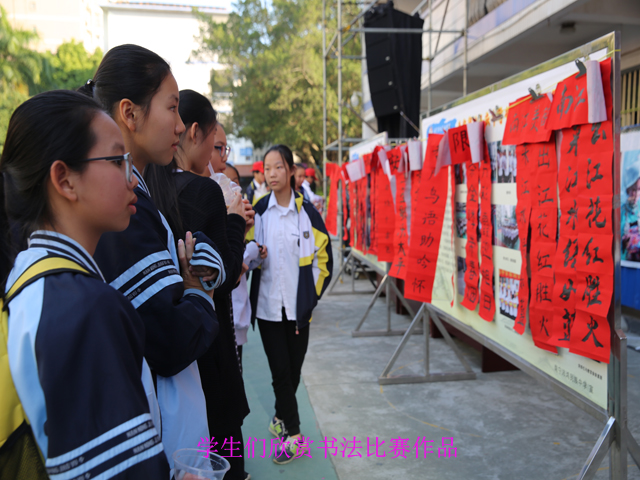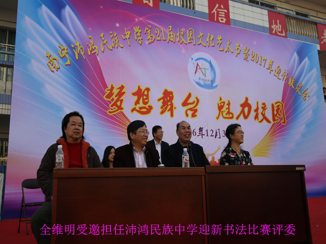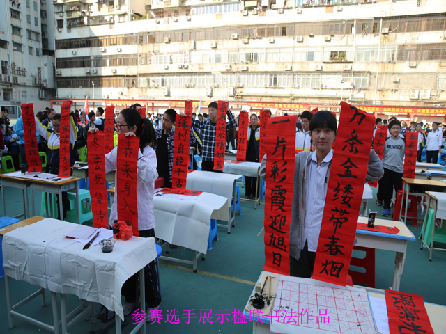 当天的迎新书法活动,南宁市图书馆读者活动部主任、书法家全维明老师受邀担任评委。活动一开始,全维明老师首先把对师生们的新年祝福化作3幅书法作品展现在大家眼前。无论是苍劲有力的“天道酬勤”,亦或是平和畅达的“上善若水”,还是笔精墨妙的“福”字,都展现出艺术家的深厚功底,师生无不拍手称赞。随后进行的学生书法比赛,共分软笔书法和硬笔书法两个内容,初一到初三的30个班级都派出了2名代表参加比赛。孩子们尽情挥毫,把新年的祝福书写在副副楹联之上,把对春的赞美寄托在首首诗歌之中,不少同学们的作品,还得到了评委老师的高度肯定。比赛毕,评委老师及同学们的作品在现场一一陈列展示,红红的楹联吸引了众多师生、家长驻足观赏。当天的校园文化艺术节中,还设置了欢乐千家宴、水果拼盘大赛、歌手大赛、奇趣商业街等内容,共有近2千师生及家长参加。