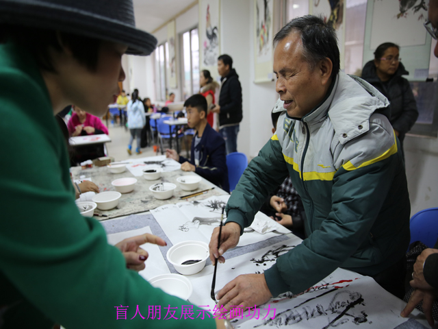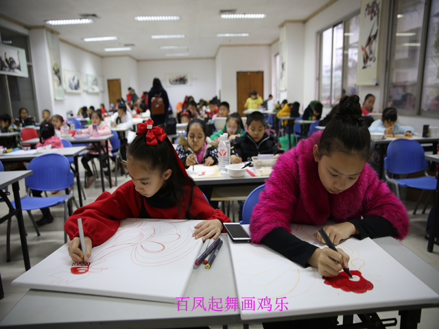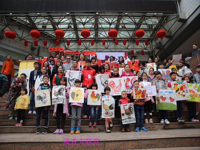 百凤起舞画鸡乐”活动邀请了中国著名画家翁文忠现场指导,广西残联副主席、广西盲人协会主席陶进与南宁市舍得残疾人职业学校的视障孩子、青少年读者共70人参与现场画鸡比赛。同时,现场的“曾柏良师生盲画艺术展”还展出了30多幅盲人画就的雄鸡图,逾百幅形态各异的雄鸡生动有趣,惟妙惟肖,展现了绿城儿童对新年的祈愿。