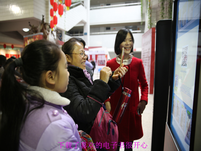 南宁市图书馆充分运用国家图书馆的数字图书馆“网络书香过大年”的数字资源来策划活动,吸引了不少读者参与。读者可以通过在南宁市图书馆网站上点击“网络书香过大年”链接到国家图书馆,共享由国家图书馆打造的丰富的中国年俗文化活动春节资源礼包,包括展览、楹联文化古籍电子版、精选楹联、国图公开课等。同时,在工作人员的指导下,读者还可以通过数字图书馆推广工程的微信公众号参与“古语传情·嘉联迎春”电子有声贺卡、“书香博文·金鸡唱榜”趣味闯关答题活动,赢取精美礼品!在活动现场,数字阅读机旁围绕着一群“手机族”,不时传来阵阵笑声。原来,读者用手机在数字阅读机上扫描二维码,即可下载电子图书,成功后可参与转盘抽奖,获得电子书阅读卡、帆布书包、笔记本等新年的奖品。