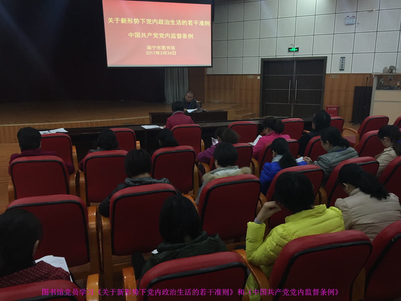 2月24日,南宁市图书馆党支部在二楼多功能厅组织学习《关于新形势下党内政治生活的若干准则》和《中国共产党党内监督条例》,由图书馆副馆长陆庆同志主持,全体党员参加了会议。
