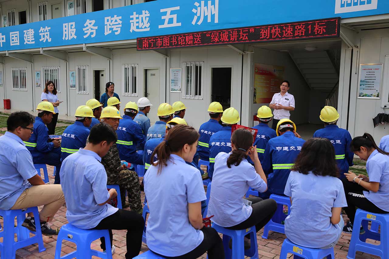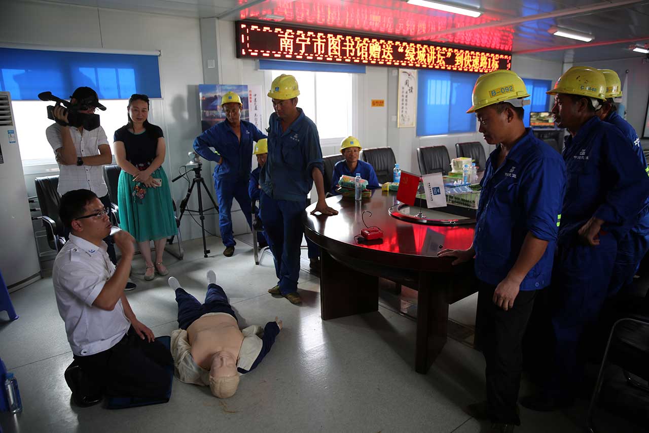 在活动中,不仅汽车图书车开进了工地,让工友们饱尝精神食粮;南宁市图书馆还准备了有奖竞答活动;同时,“绿城讲坛”还将“工地安全与急救知识”专题讲座带到工友们当中,受到了外来务工人员的欢迎。南宁市急救医疗中心培训科邓双昌副科长带来的“工地安全与急救知识”专题讲座,结合案例为工友们分析了日常工作中工地常见的几种危害个人人身安全的事故,如触电、高空坠物、碰撞等,