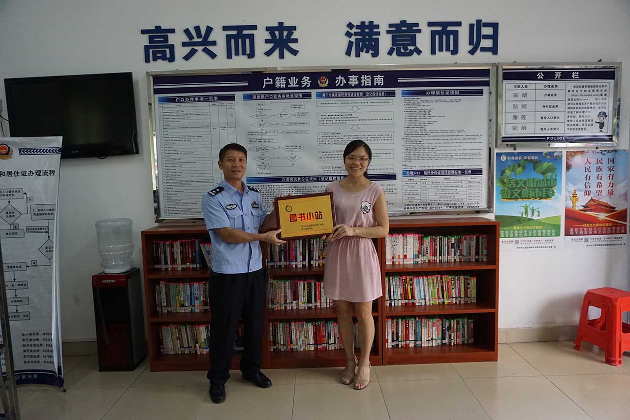 今年是中国人民解放军建军90周年,图书馆作为文化服务和传承的重要阵地,同时也肩负了文化传播的重要使命。为了更好地发挥图书馆的服务职能,满足警民多方面的阅读需求,7月31日下午,在八一建军节到来之际,南宁市图书馆“流动书香”服务小分队一行4人来到位于南宁市江南区福建园派出所的办证大厅,与该派出所携手共同打造了位于派出所的第一个“图书小站”。福建园派出所王所长参加了图书小站的揭牌仪式,双方在现场签订了建站协议。