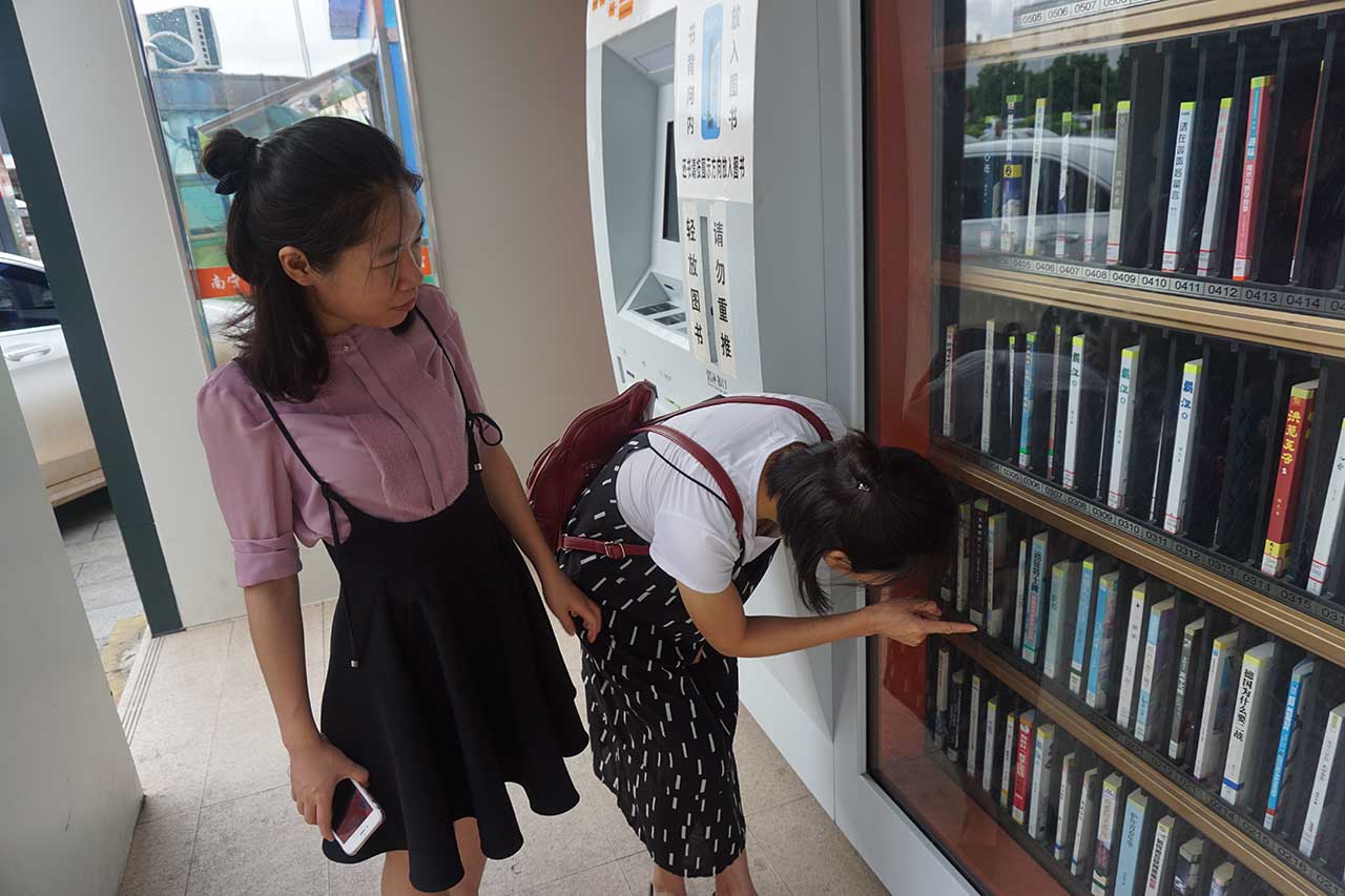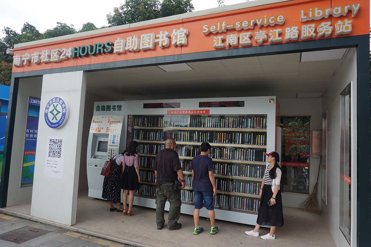 第一站首先参观位于经开区金阳路的室内综合式自助图书馆,第二站参观位于江南区亭江路的室外雨棚式自助图书馆。南宁市10个社区24小时自助图书馆自投入使用后便显现其优越性,给读者带来了极大便利,节约了读者许多人力、财力和时间,这项惠民的创新之举受到南宁市民普遍好评与点赞。然而这些自助点均离我馆有一定的距离,部分职工还没有实地观摩过,借此机会技术部的同事为大家演示并详细讲解了社区24小时自助图书馆的运作流程,有些学员学习过后还亲自操作了办理读者证、借书、还书的每一个步骤,达到了很好的学习效果。