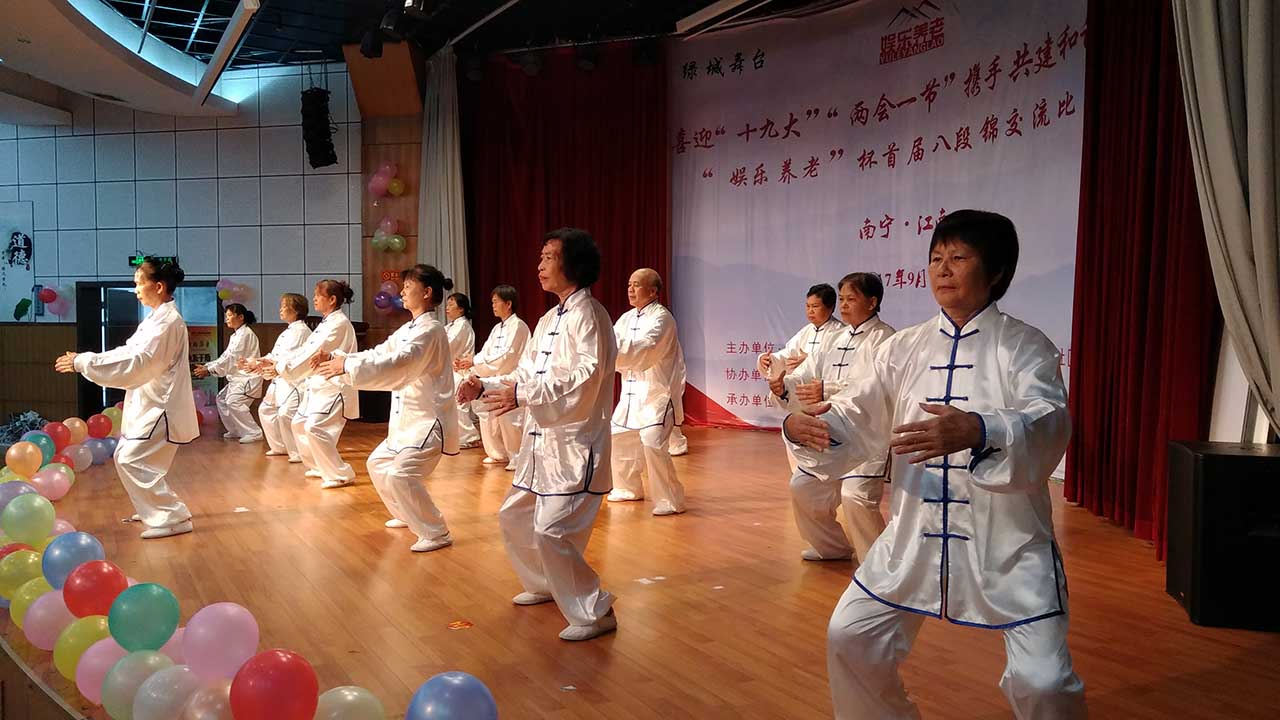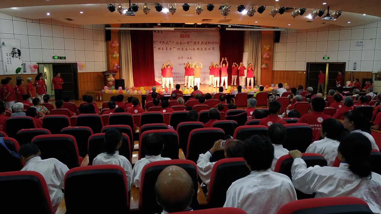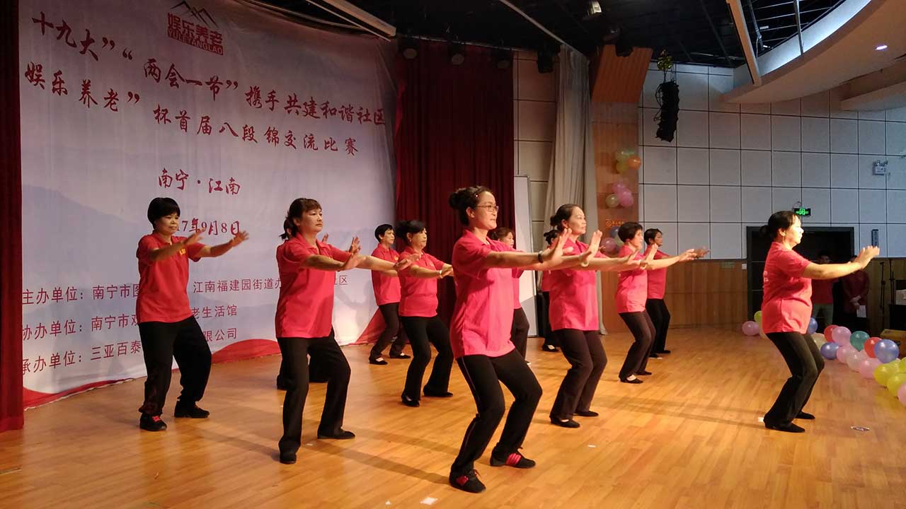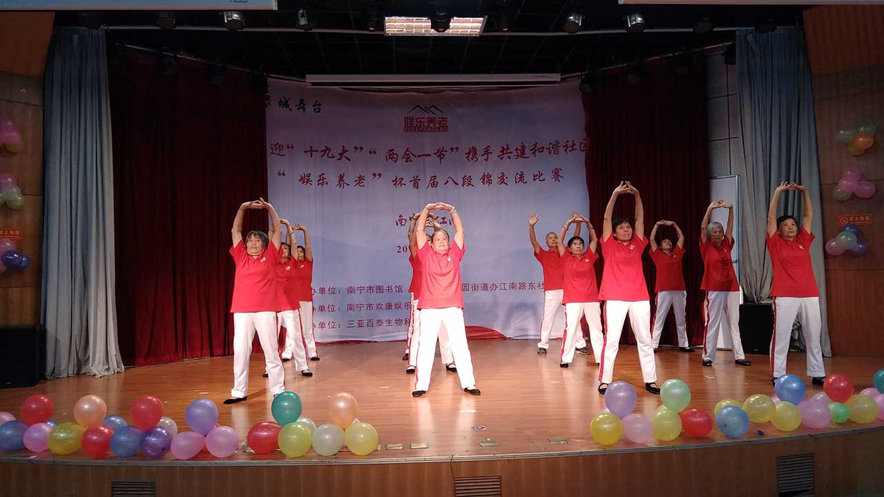 9月8日上午,南宁市图书馆携手南宁市江南路东社区及其旗下的娱乐养老生活馆举办了一场喜迎十九大、南宁“两会”和民歌节携手共创和谐社区暨“娱乐养老杯”首届八段锦交流比赛。