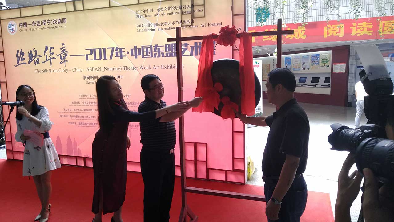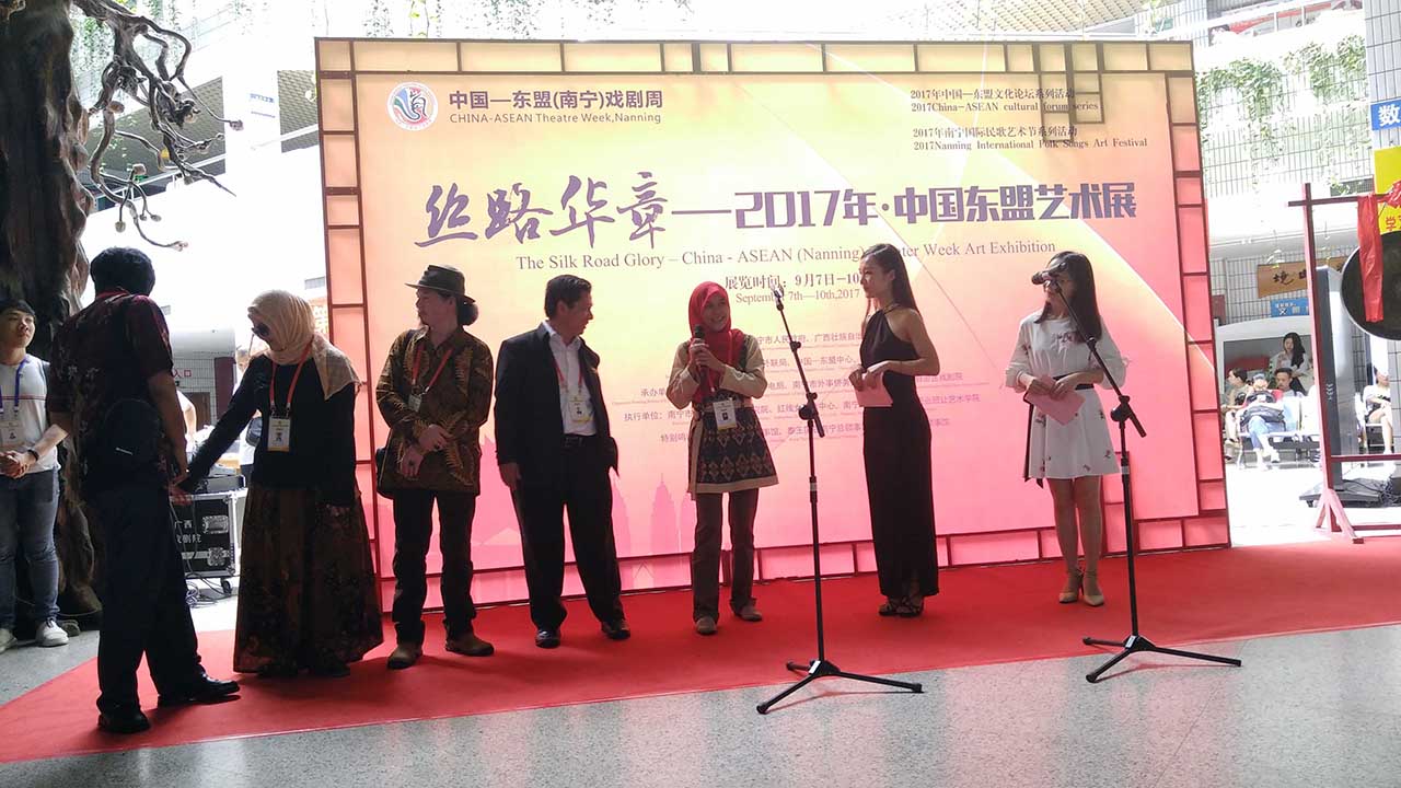 为了传播中国和东盟的传统文化和民族艺术,向中国和东盟的艺术家提供深入交流的机会,2017年9月7日至10日,2017年中国东盟南宁戏剧周系列活动之东盟艺术展在南宁市图书馆精彩开展。本次艺术展是2017年中国——东盟文化论坛系列活动、2017年南宁国际民歌艺术节系列活动之一。艺术展由南宁市人民政府、广西壮族自治区文化厅主办;由南宁市文化新闻出版广电局、南宁市外事侨务办公室、广西壮族自治区戏剧院承办;执行单位是南宁市民族文化艺术研究院、红线女艺术中心、南宁市图书馆、印尼巴当让艺术学院。南宁市文化新闻出版广电局戴雪清副局长、中国艺术研究院毛小雨研究员在9月7日的开幕式上鸣锣并致辞。南宁市文化新闻出版广播电视局戴雪清副局长,红线女艺术中心主任蒙菁,南宁市艺术研究院方宁院长,中国艺术研究院麻国钧研究员,毛小雨研究员等,以及中国东盟各国演出团队的领导嘉宾都参加了开幕式并参观了展览。