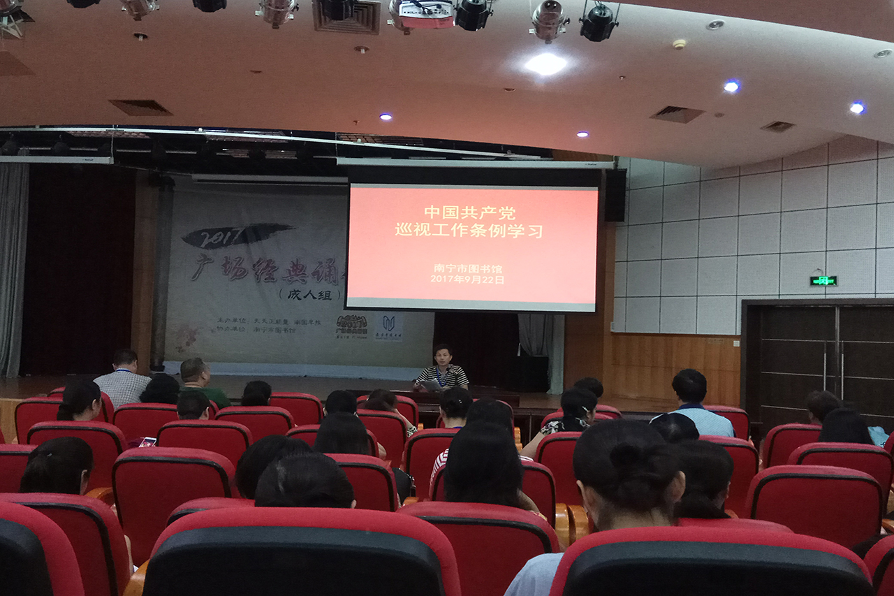 《中国共产党巡视工作条例》是为了规范中国共产党巡视工作、强化党内监督而制定的法规。为进一步深化全面从严治党,迎接党的十九大的胜利召开,贯彻学习新修订的《中国共产党巡视工作条例》,9月22日下午,南宁市图书馆召开专题学习会,全体干部职工60余人参加了学习。