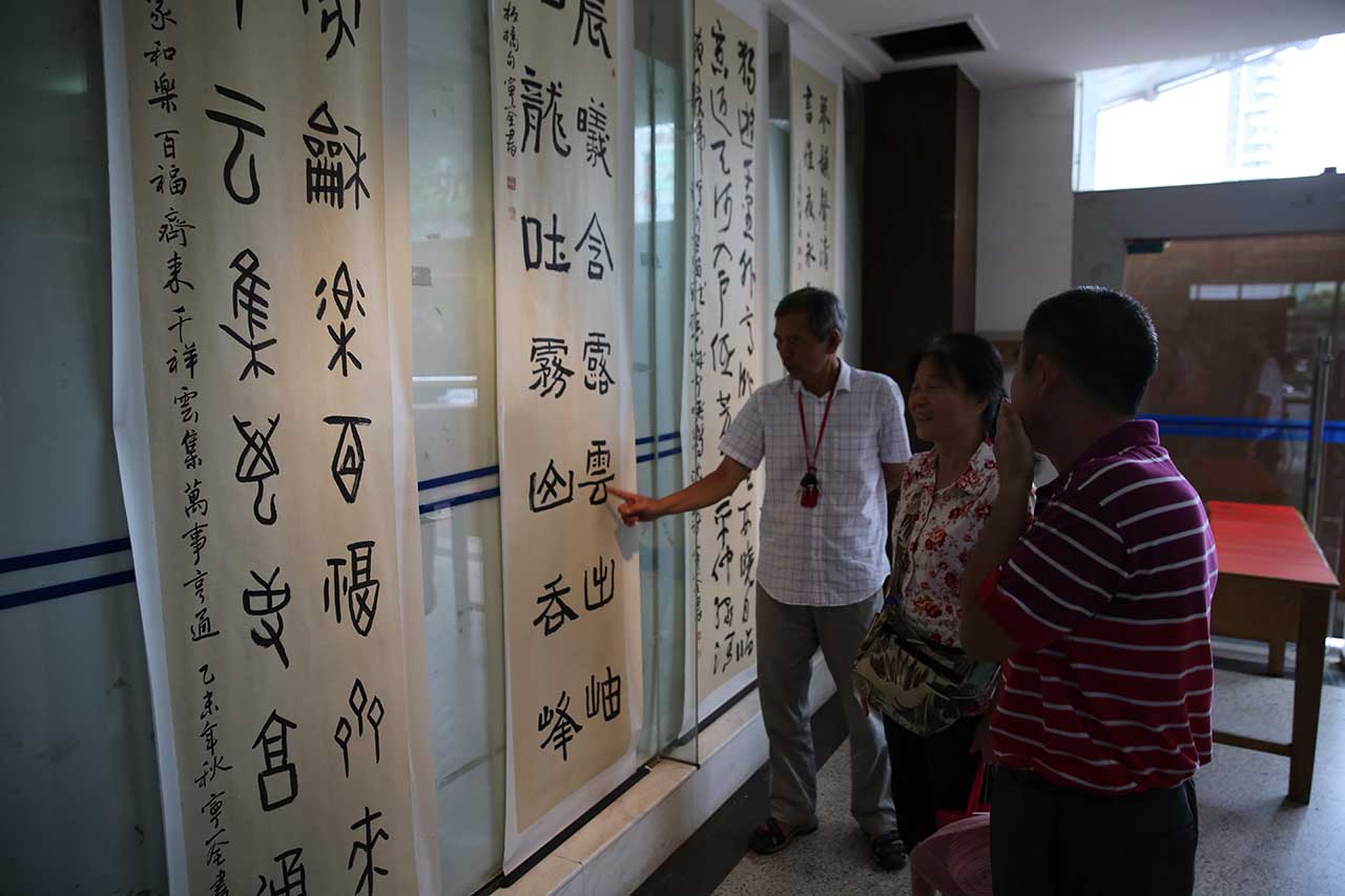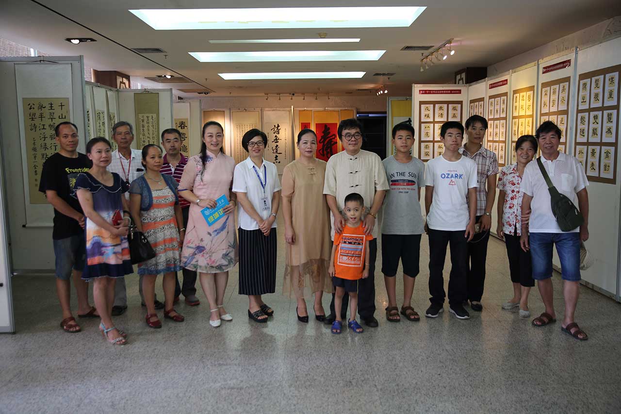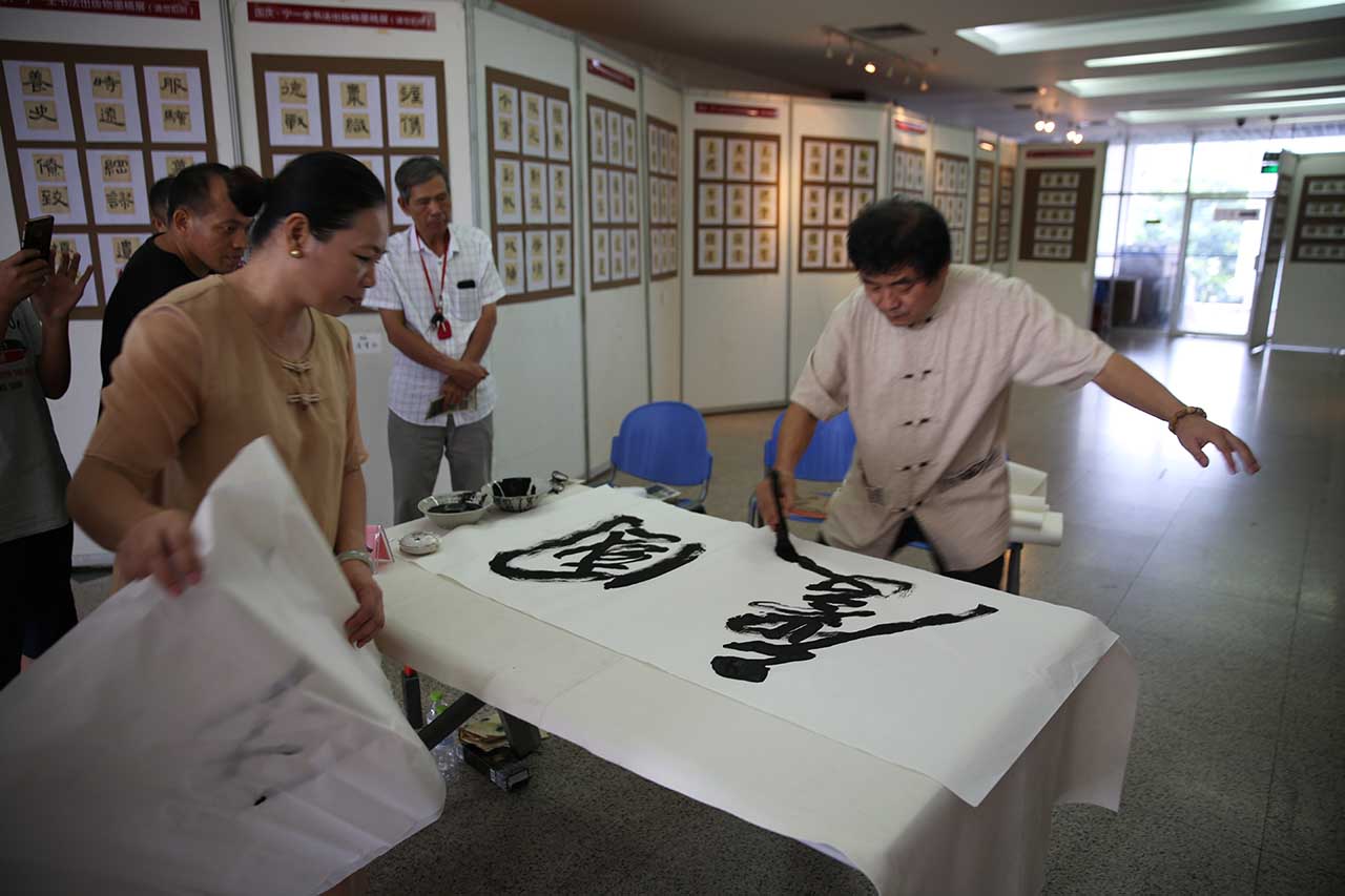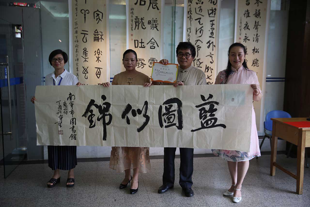 当天的活动设置有四个环节的内容。首先,宁一全先生为南宁市图书馆赠送书法作品,蒋桂香副馆长接受了赠送,一幅“蓝图似锦”落户南宁市图书馆,这幅作品将作为永久馆藏,计划在明年新馆开馆之际作为馆藏墨宝精彩展出。第二,到场嘉宾与宁一全先生在他的作品展中合影留念。第三,宁一全先生现场泼墨挥毫,展示他的书法功力,一幅“国庆”让大家直面感受中华书法的魅力。最后,现场开展的见面交流活动,使大家在观展的过程中,与宁一全先生进行零距离交流,畅谈中华书法带给人们的美好感受。