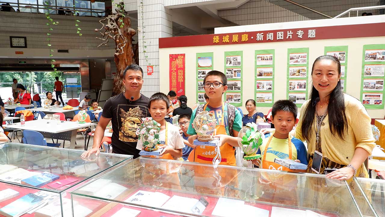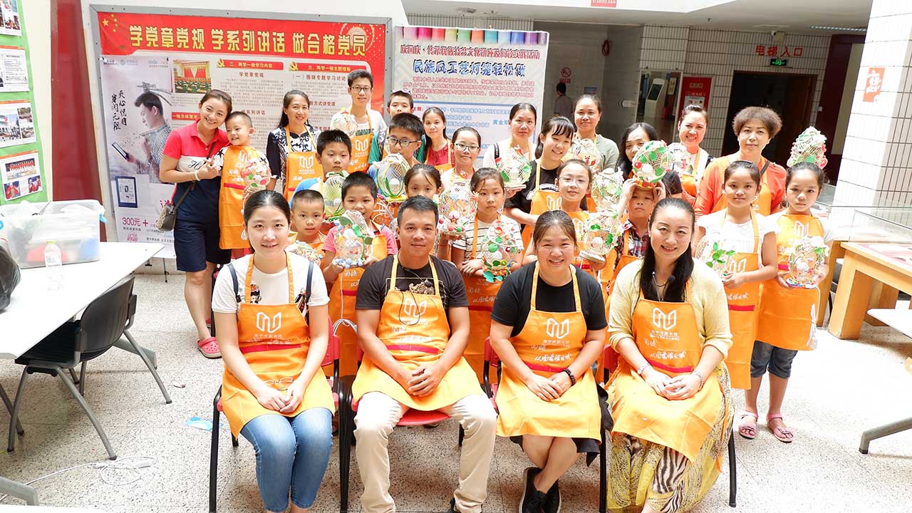 中级讲师、南宁市青苑画室的特级画师黄金军老师主讲,内容有手工作品的文化背景和历史由来这样一些概况,黄金军老师现场教授大家制作了具有民族特色的工艺灯笼,并进行现场展示。这个环节的形式就是通过主讲的现场讲演作为引导,大家进行现场手工制作。第三,在活动结束之际,获奖者和参与活动的读者朋友们身穿印有“阅读,从图书馆出发”字样的围裙和手持自己的作品一一合影,用心灵手巧来记录这举国欢庆的好日子。