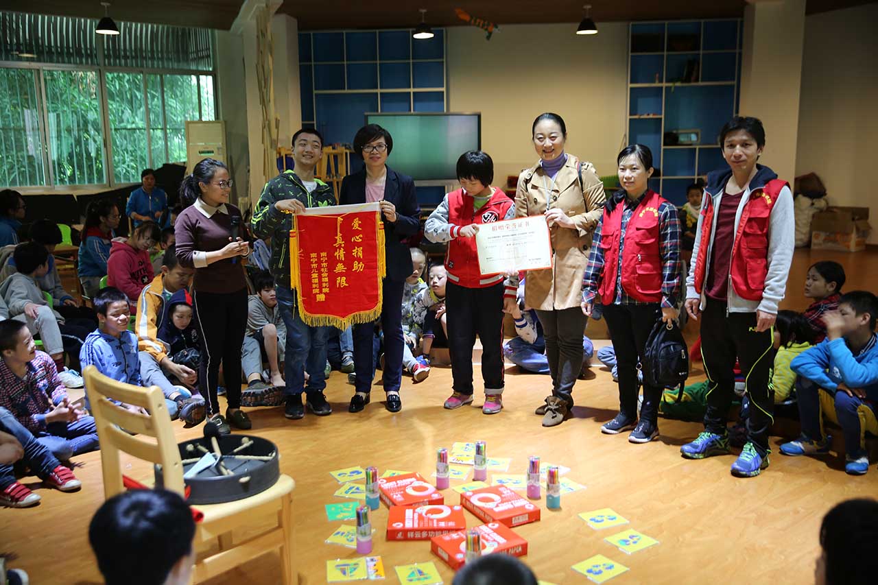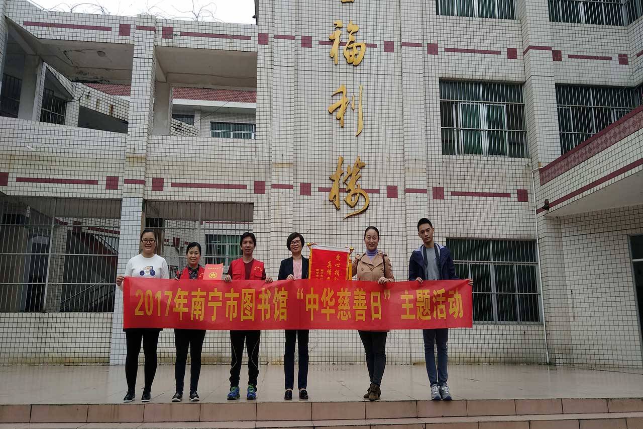 2017年10月18日,在中国共产党第十九次代表大会胜利召开之际,根据《南宁市2017年中华慈善日活动实施方案》的文件精神要求,为深入实践社会主义核心价值观,广泛宣传和贯彻落实《慈善法》,关爱未成年人、关爱残障人士,南宁市图书馆工作人员及志愿者一行五人在蒋桂香副馆长的带领下走进南宁市福利院儿童部,为孩子们带来一批价值近2000元的文体用品和图书馆人的殷殷祝福。南