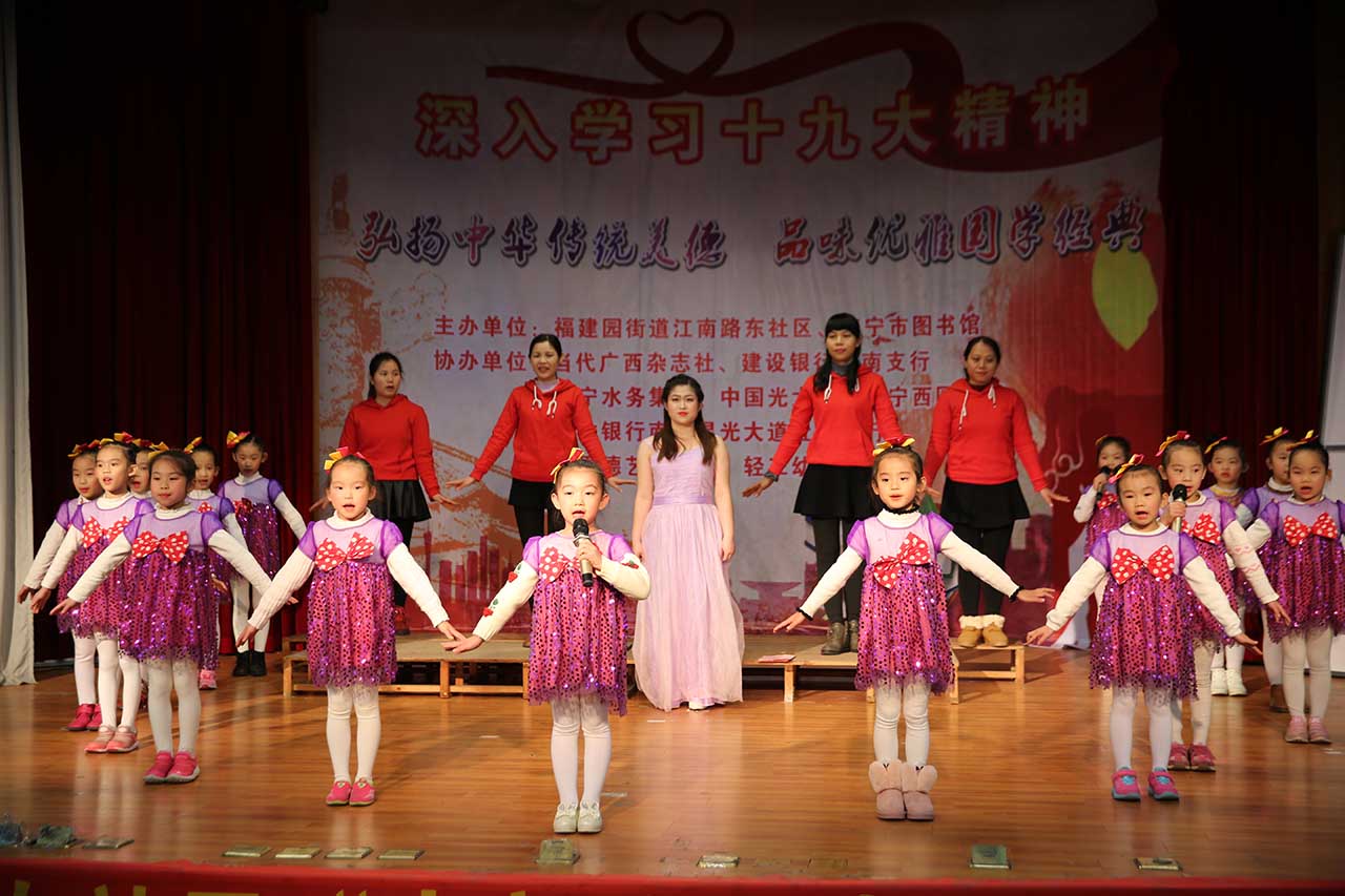 本次活动于1月29日下午在南宁市图书馆多功能厅举办,近三百人参加了活动。参与者有老人,有青少年。大家热情高涨,通过朗诵《从来,没有这样一种梦想让人沸腾》、《海燕》、《沁园春·雪》、《礼运大同篇》、《弟子规》等篇目,让大家品味了优雅国学经典;由小朋友快板演奏的《畅想好家风》、手语舞《感恩的心》以及由老人们组成的江南叹歌队演唱的《“歌唱十九大”疍家歌》等节目,弘扬了中华传统美德,精彩的演出搏得了阵阵掌声。