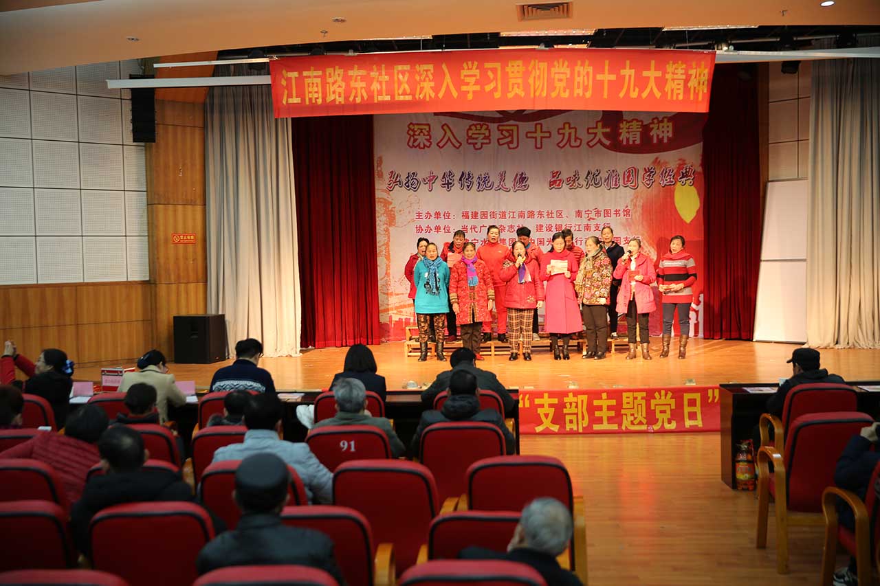 “盛世和谐添锦绣,伟业腾飞更辉煌。”党的十九大报告指出,满足人民过上美好生活的新期待,必须提供丰富的精神食粮。完善公共文化服务体系,深入实施文化惠民工程,丰富群众性文化活动——党的十九大会议精神深入人心。为迎接2018年新春的到来,南宁市图书馆携手江南路东社区开展了一场别开生面的2018年“朗读原著·理解经典”主题活动,通过朗读的形式,结合实际,共同深入学习党的十九大精神,感受经典文学的魅力。