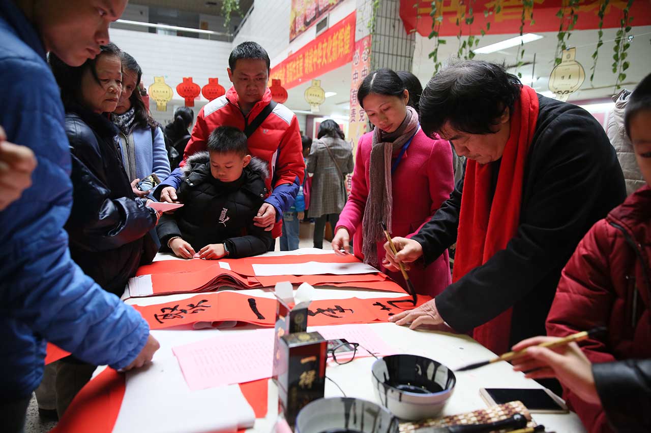 活动当天,南宁市图书馆邀请到了中国书法家协会会员,中国硬笔书法协会会员宁一全等四名书法家来到活动现场,挥毫书就满堂春,为读者送上红红火火的春联,也送出了最吉祥的祝福。为了得到书法家的墨宝,读者们在大厅里排起了长龙,而获赠春联的读者相互之间还品评交流,喜悦之情溢于言表。