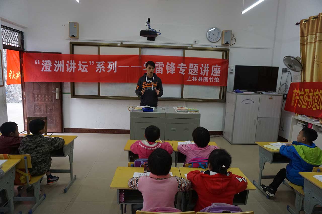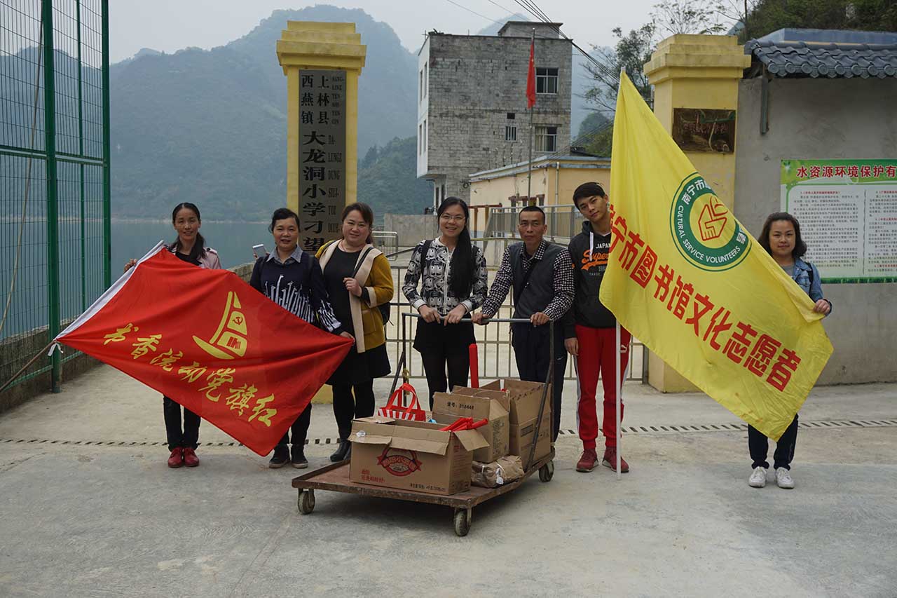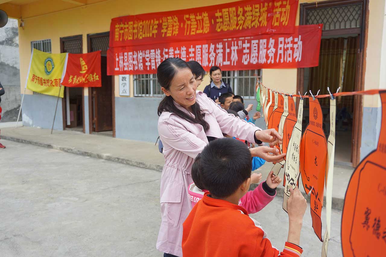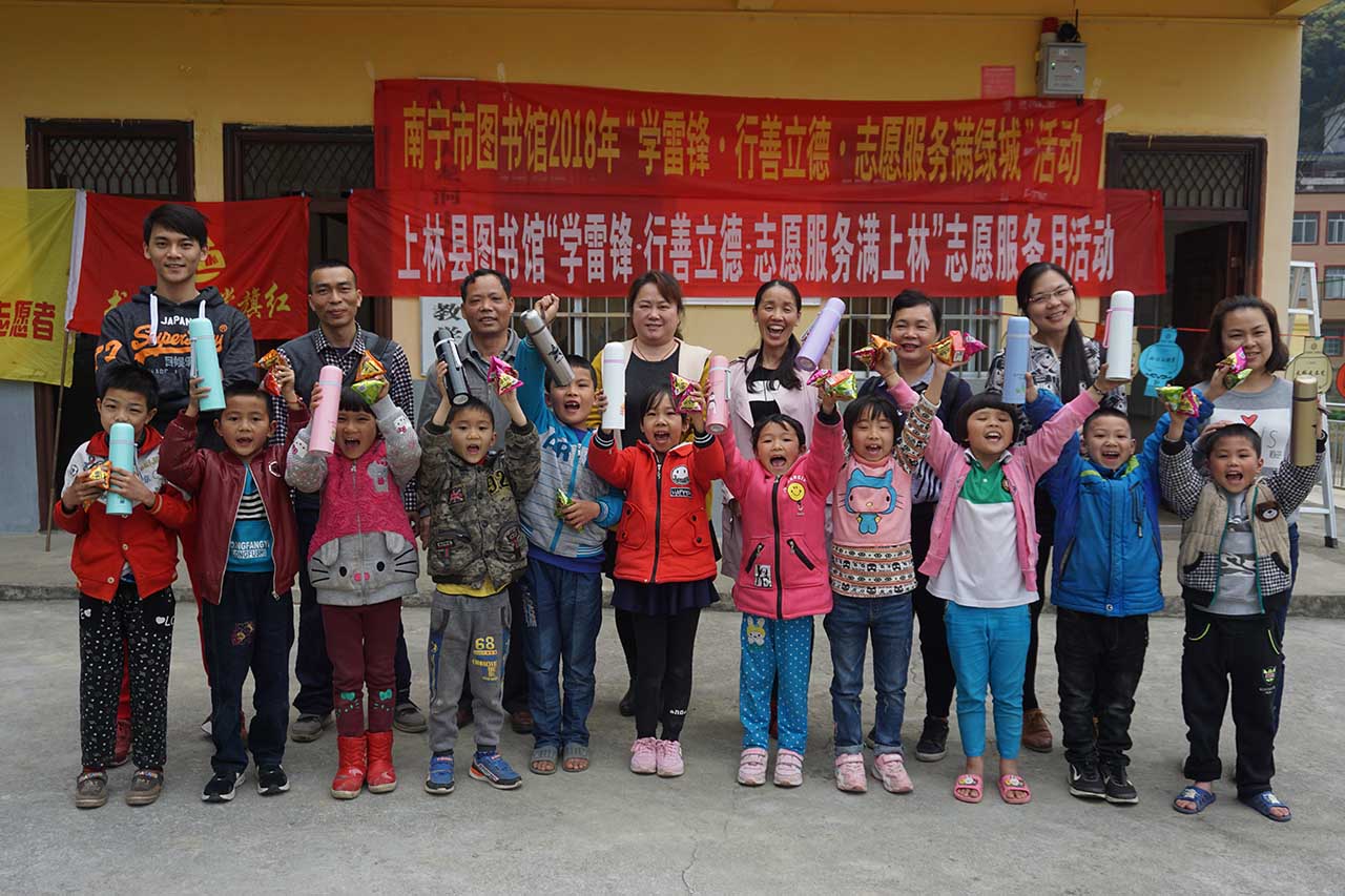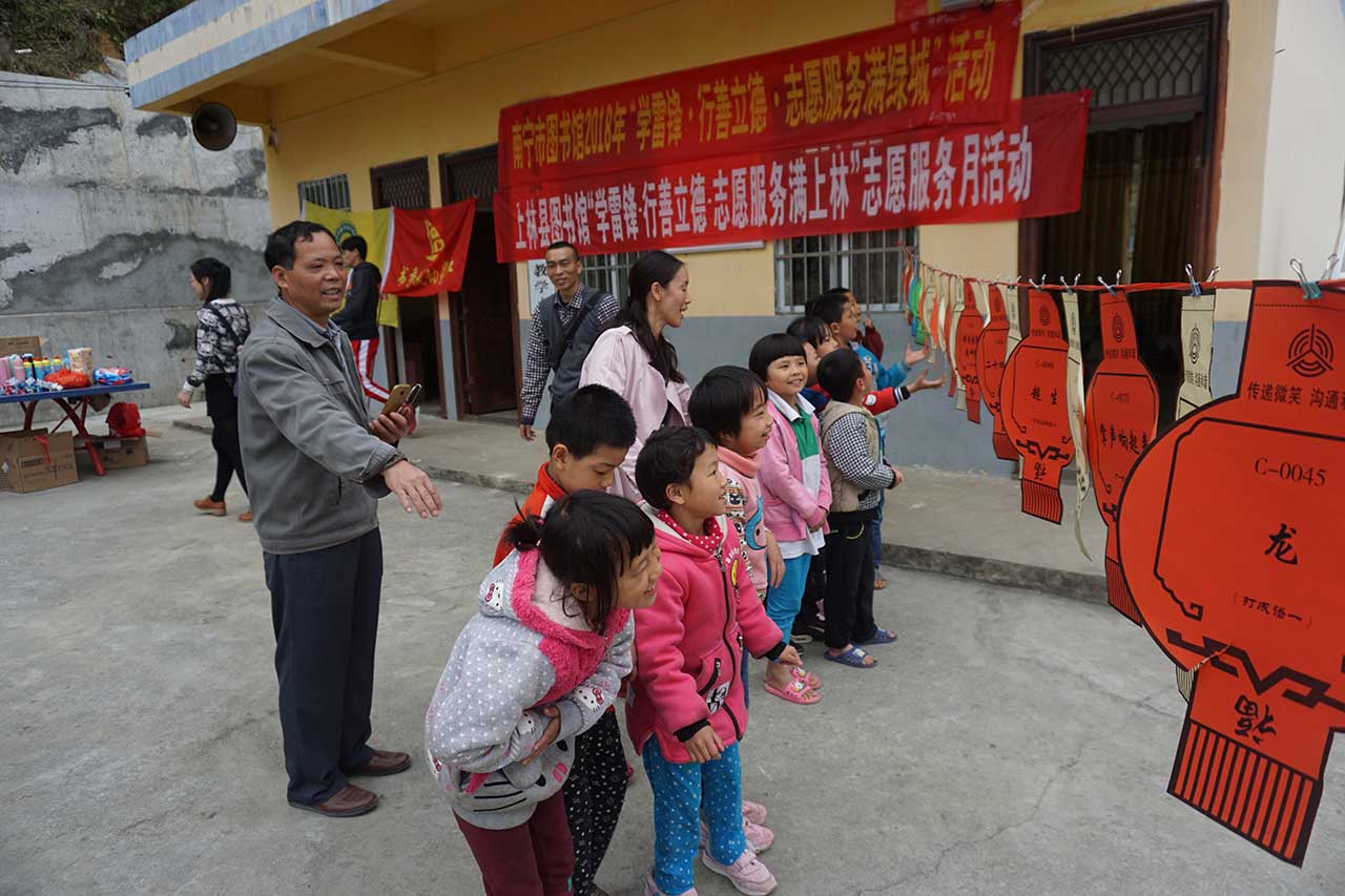 为贯彻落实中央“深入开展学雷锋活动,采取措施推动学习活动常态化”的精神,传播“学习雷锋,奉献他人,提升自己”志愿服务理念,大力弘扬奉献感恩的精神,培育和践行社会主义核心价值观,根据中宣部、自治区党委宣传部工作部署,结合我馆实际,在3月12日下午,由我馆辅导部副主任贺南潮率领文化志愿者一行5人联合上林县图书馆同仁3人一起来到上林县大溶洞小学刁望教学点针对这里的留守儿童开展关爱活动。