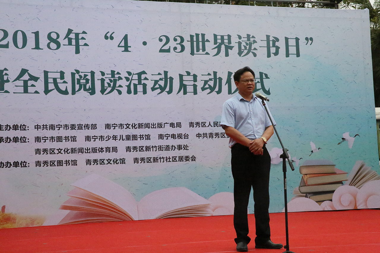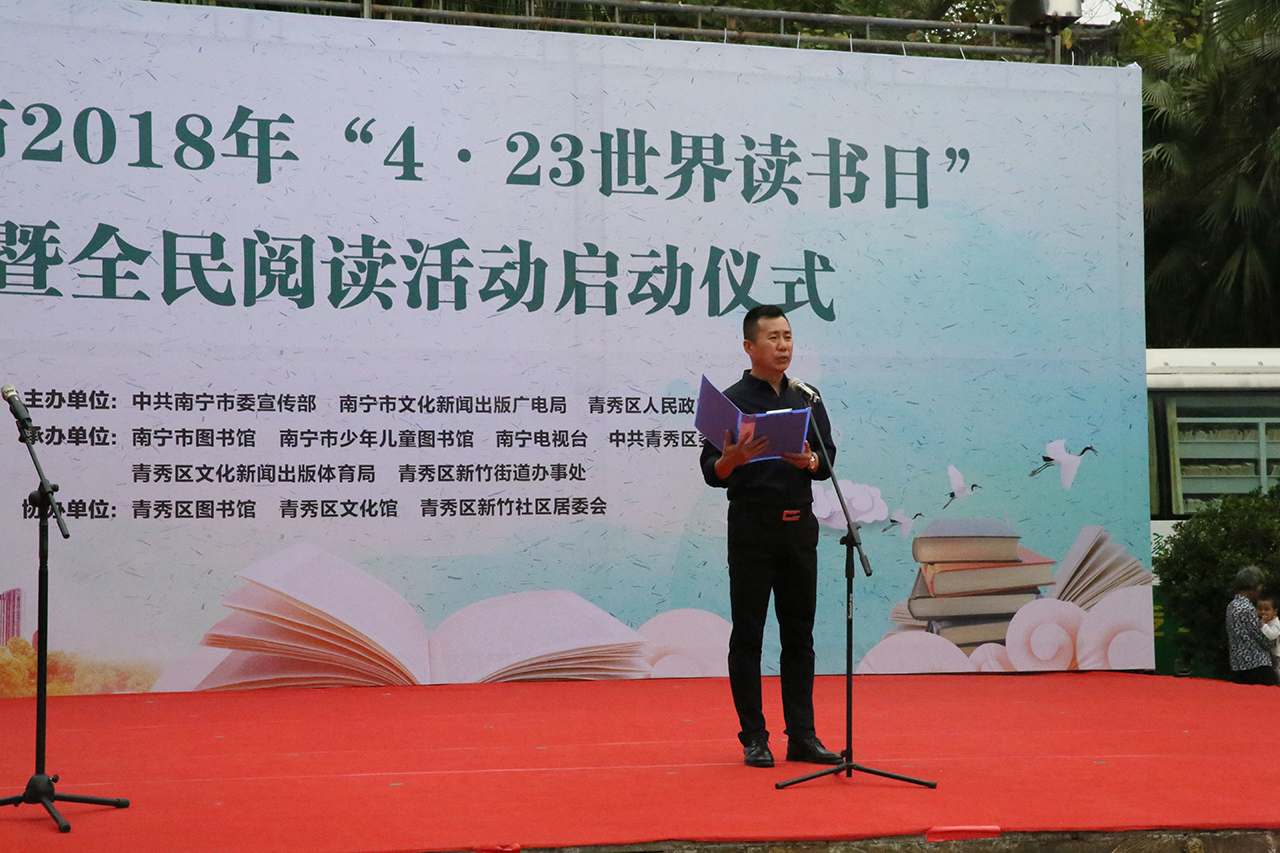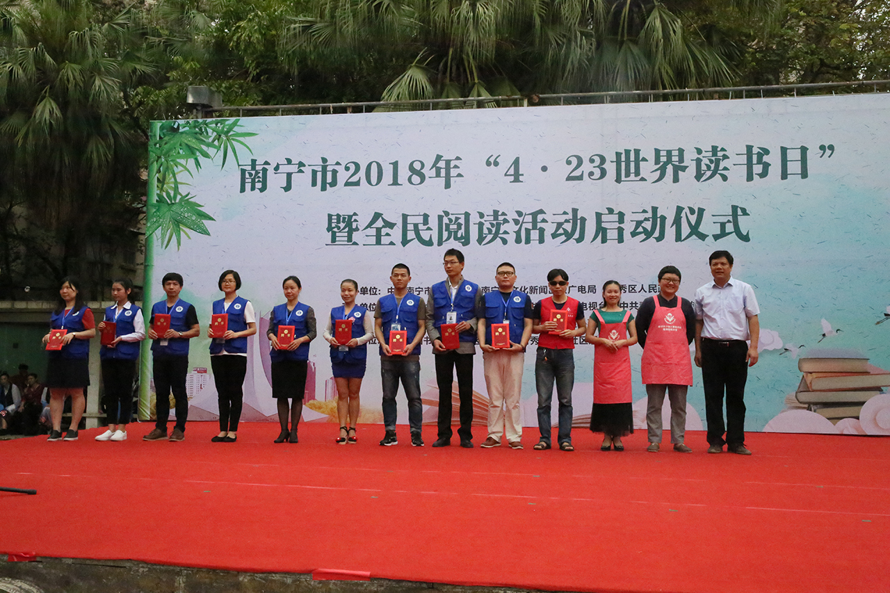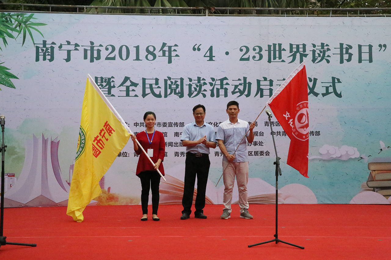 今年的4月23日是第二十三个“世界读书日”,为深入学习贯彻落实《公共文化服务保障法》和《公共图书馆法》,推广阅读文化,持续营造我市“书香绿城•全民阅读”的良好氛围。当天的活动,旨在为鼓励南宁市民读者拓宽相关主题的阅读领域,善用既免费又便捷的公共图书馆,在书海中畅游,体验广博多元的资讯,让生命更丰盛。活动由南宁市青秀区人民政府党组成员、副调研员杨华龙主持。南宁市电视台播音员党军首先向大家宣读了《全民阅读倡议书》。南宁市委宣传部副部长李德山上台致辞,并向南宁市图书馆、南宁市少年儿童图书馆“文化志愿者服务队”授旗。其后,南宁市文新广局局党组成员、副局长何家军致辞,并为南宁文化惠民项目社区24小时自助图书馆志愿馆长们颁发了聘书。作为南宁市图书馆招募的第一批“志愿馆长”,他们即日上岗,深化社区24小时自助图书馆服务,提升图书馆文化服务专业化。