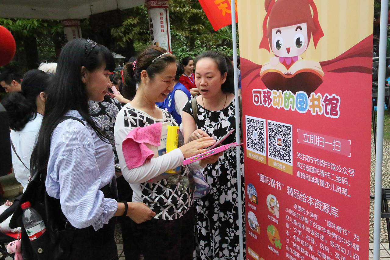 随后,图书馆阅读推广活动、现场图书阅读及朗读体验活动拉开序幕。南宁市图书馆汽车图书馆在社区开展免费借阅读活动,为到场读者免费提供书刊阅读服务,4000册图书随读者自由阅读,并现场办理借书证。同时,《公共文化服务保障法》《公共图书馆法》展板宣传及《公共文化服务保障法》《公共图书馆法》知识有奖问答进社区互动活动、针对小朋友们精心策划的“数字阅读资源推广:哪吒看书带回家——爱上阅读爱上T A”扫码有礼活动也吸引了众多社区居民参与。当天开展的一系列“阅读,与法同行”主题阅读推广活动在社会各界引起强烈反响,广大市民无不感受到绿城的书香气息日渐浓厚。