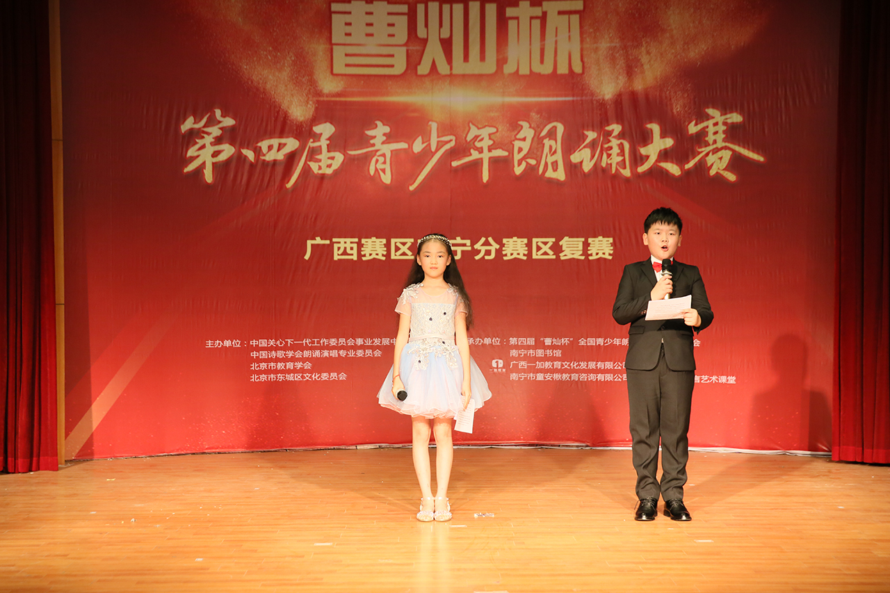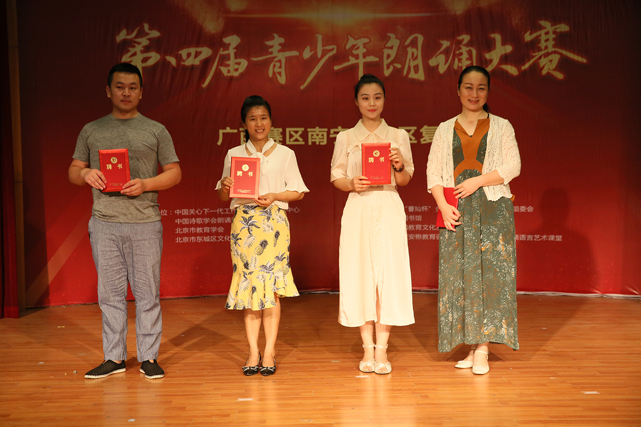 5月5日,在南宁市图书馆多功能厅,第四届“曹灿杯”青少年朗诵大赛广西赛区南宁分赛区复赛成功举行,本次比赛邀请了北京电台培训部资深少儿播音主持教师、全国语言协会会员朱国平老师;广西艺术学院播音主持硕士研究生、广西艺术学院播音主持系教师黄鑫磊;广西艺术学校播音主持教师刘东方担任评委。南宁市图书馆读者活动部副主任黄珂莅临比赛现场,同时为童安楸教育-糖果语言艺术课堂的四位老师颁发了南宁市图书馆“市民朗诵团”志愿辅导员聘书,今后四位老师将把专业、系统的朗诵知识带到市民读者当中,让更多的人喜欢阅读、喜欢朗诵。