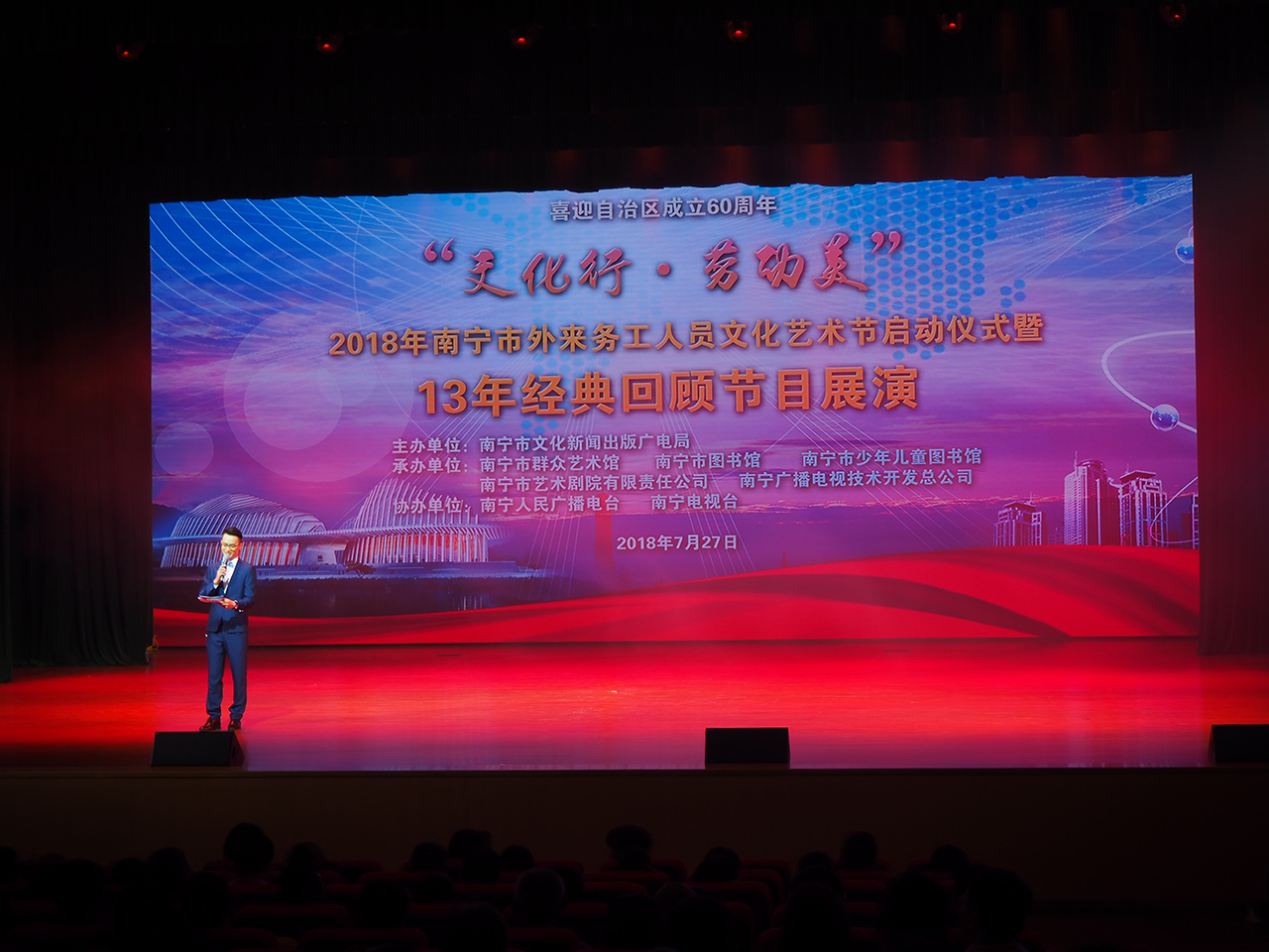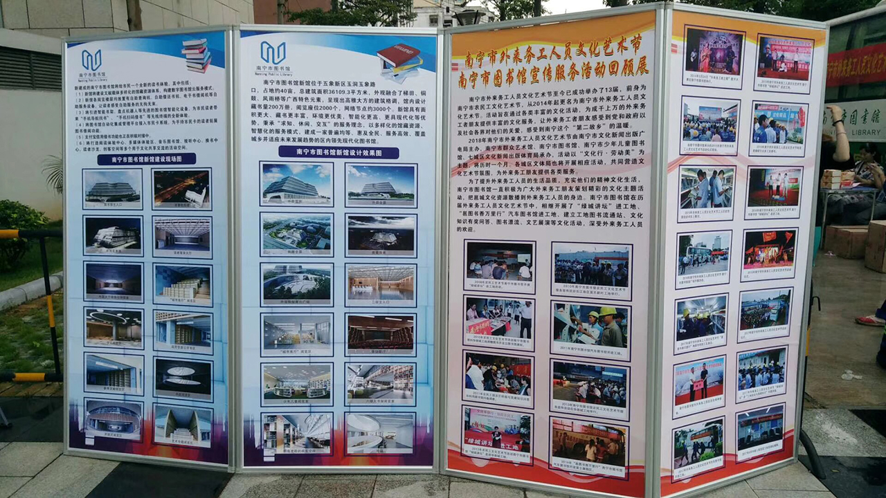 7月27日晚,由南宁市文化新闻出版广电局主办“文化行·劳动美”2018年南宁市外来务工人员文化艺术节启动仪式暨13年经典回顾节目展演在南宁市群众艺术馆举行。南宁市图书馆积极配合局属各单位共同开展2018年外来务工人员文化艺术节启动活动,于启动仪式当天举办了服务宣传主题活动。