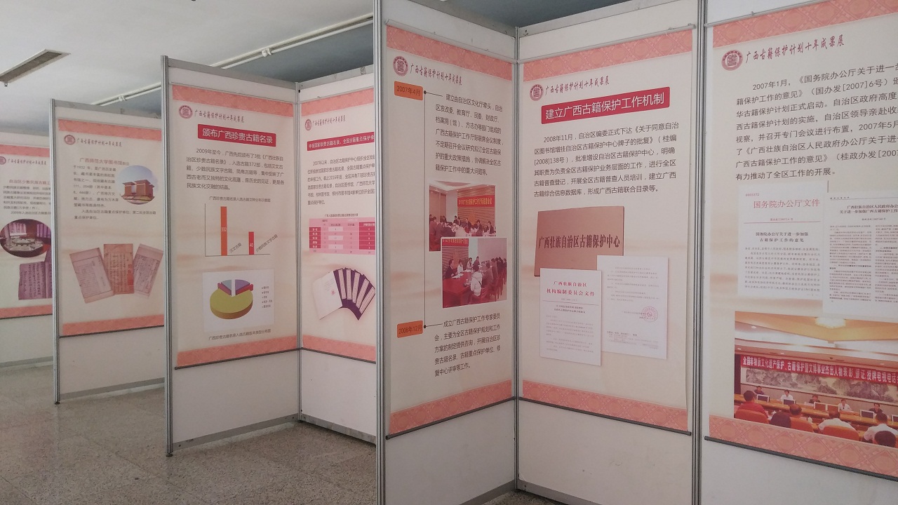 8月17日,由广西壮族自治区古籍保护中心、南宁市图书馆举办的广西古籍保护计划10年成果展在南宁市图书馆展出。展览从建立古籍保护工作机制、颁布广西珍贵古籍、抢救保护民族文献、提升古籍修复水平等方面,图文并茂地展示了10年来广西实施中华古籍保护计划取得的阶段性成果。