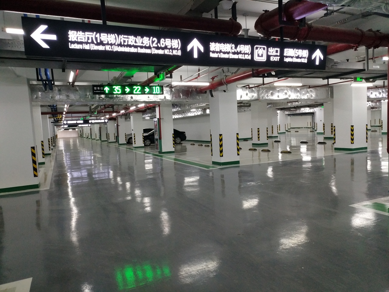 负一层的停车场有178个机动车停车位,其中有3个充电桩可为新能源汽车充电;地面还有42个停车位,据说车棚顶部是太阳能光伏板,可为新馆夜景灯光提供能量。