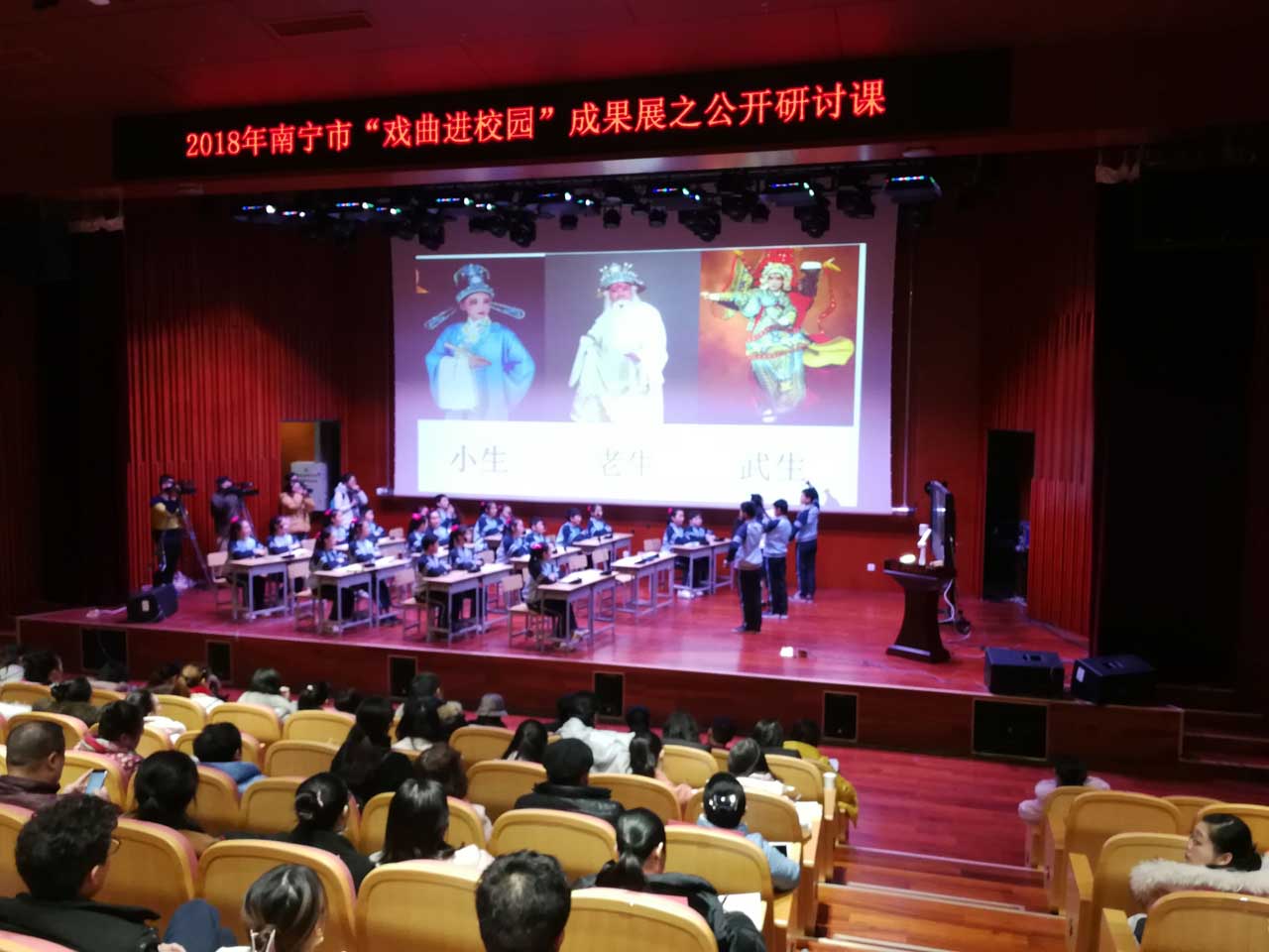 南宁市“戏曲进校园”内容十分丰富。推出了“五个一”戏曲进校园的南宁模式,即通过一场演出,引起学生兴趣,对戏曲文化有初步认知;通过一堂课,让学生深入了解戏曲知识,培育戏曲种子;通过一项培训,给学生打造亲身感受戏曲的机会,打造一支兴趣队伍;通过一次展览,引领学生体会戏曲文化底蕴;通过一套教材,使戏曲教学更加专业化,为学校开展常态活动提供指导。