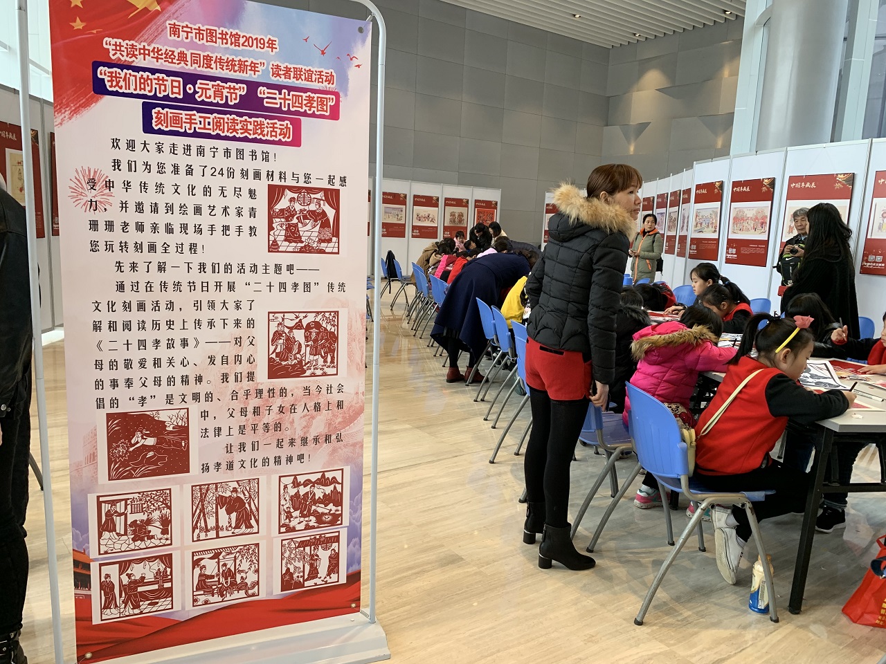 中国自古以来以“孝”治天下,孝道也是中国基本的道德规范。为了宣传孝道,让广大市民学习中华传统文化,提升市民的艺术涵养,南宁市图书馆在2019年2月16日(星期六)举办了一场主题为“我们的节日·元宵节”的“二十四孝图”刻画手工阅读实践活动,此活动为2019年南宁市图书馆“同筑中国梦·共度书香年”读者联谊活动系列之一。