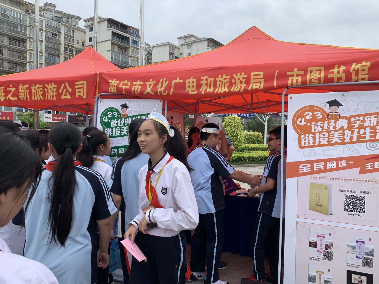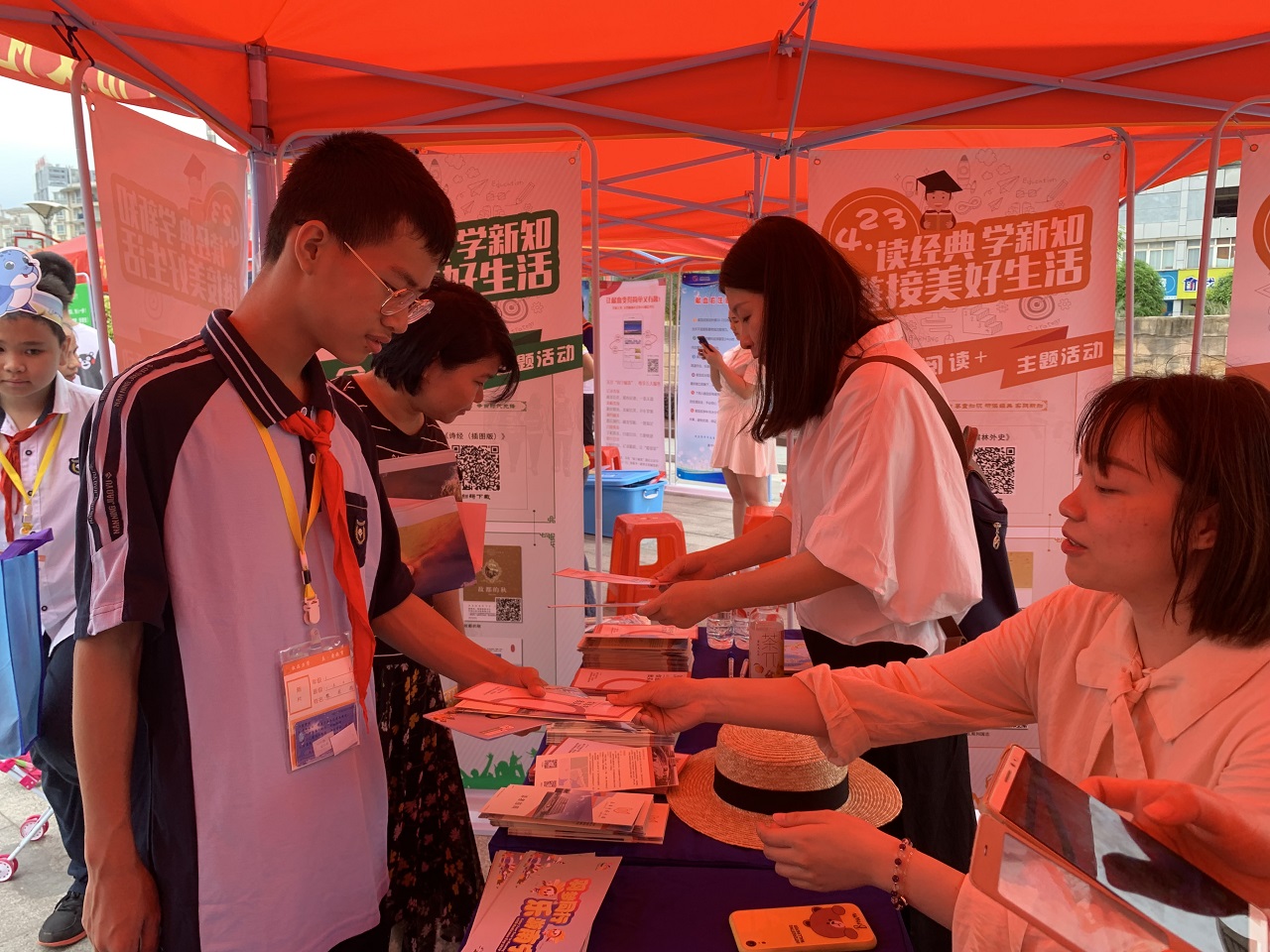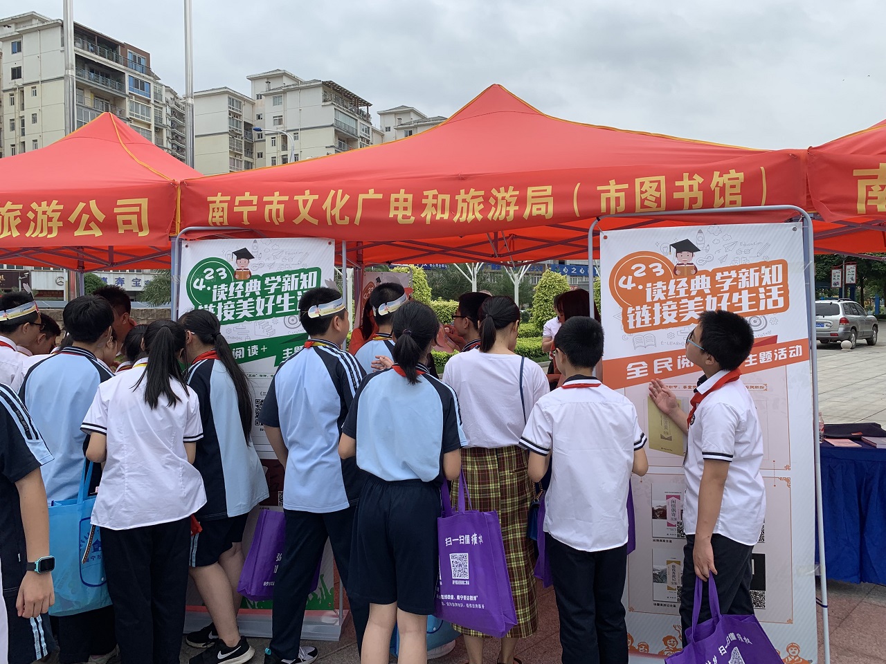 在参加启动仪式之后,南宁市图书馆和其他数十个协办单位一起,在南宁市科技馆门前广场设立宣传点为广大市民进行科普宣传活动。南宁市图书馆带上了南宁市图书馆新馆介绍、“你选书我买单”活动及南宁市周边旅游景点的宣传单,向市民朋友们进行文化宣传。同时,南宁市图书馆还在现场开展了扫码阅读电子图书的活动,市民读者只要用手机扫码下载收藏,就能把经典名著带回家,随时利用碎片时间进行阅读学习,现场市民读者纷纷驻足在工作人员的指导下,拿出手机对喜欢的书籍进行扫码操作。