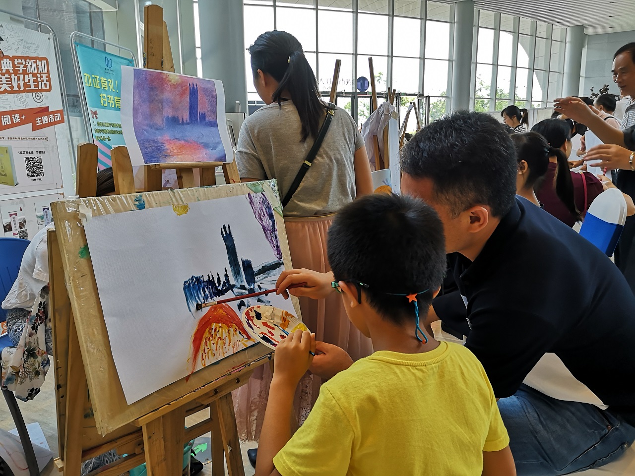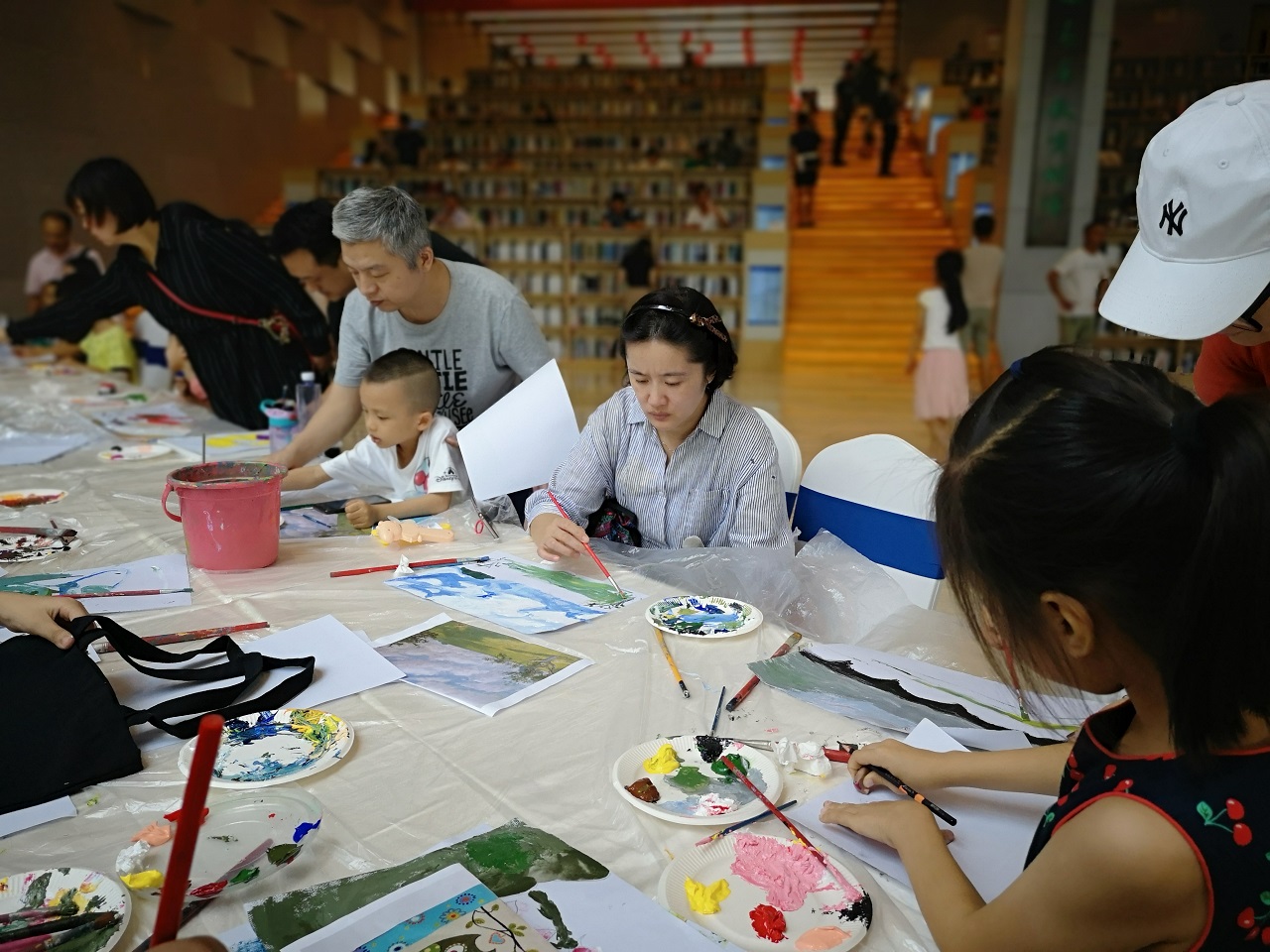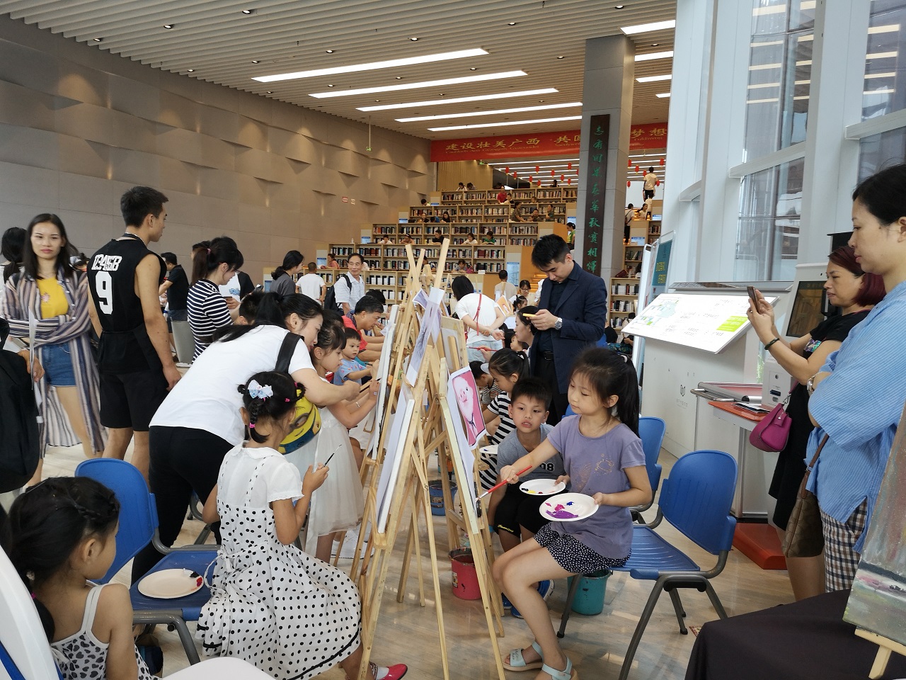 之后,为开展主题绘画阅读活动,主要阵地从人声鼎沸的铜鼓广场转移到了现代化的城市客厅。在空间感和摩登感十足的大厅中央,读者朋友们热烈地进行着扇面绘画,彩绘中国书画、石头画、布面丙烯画等艺术绘画体验活动。无论是大读者还是小读者都被现场浓厚的艺术氛围熏陶着,一边享受这艺术的氛围,一边体验着由南宁市图书馆精心准备的创意绘画活动,惬意无比。