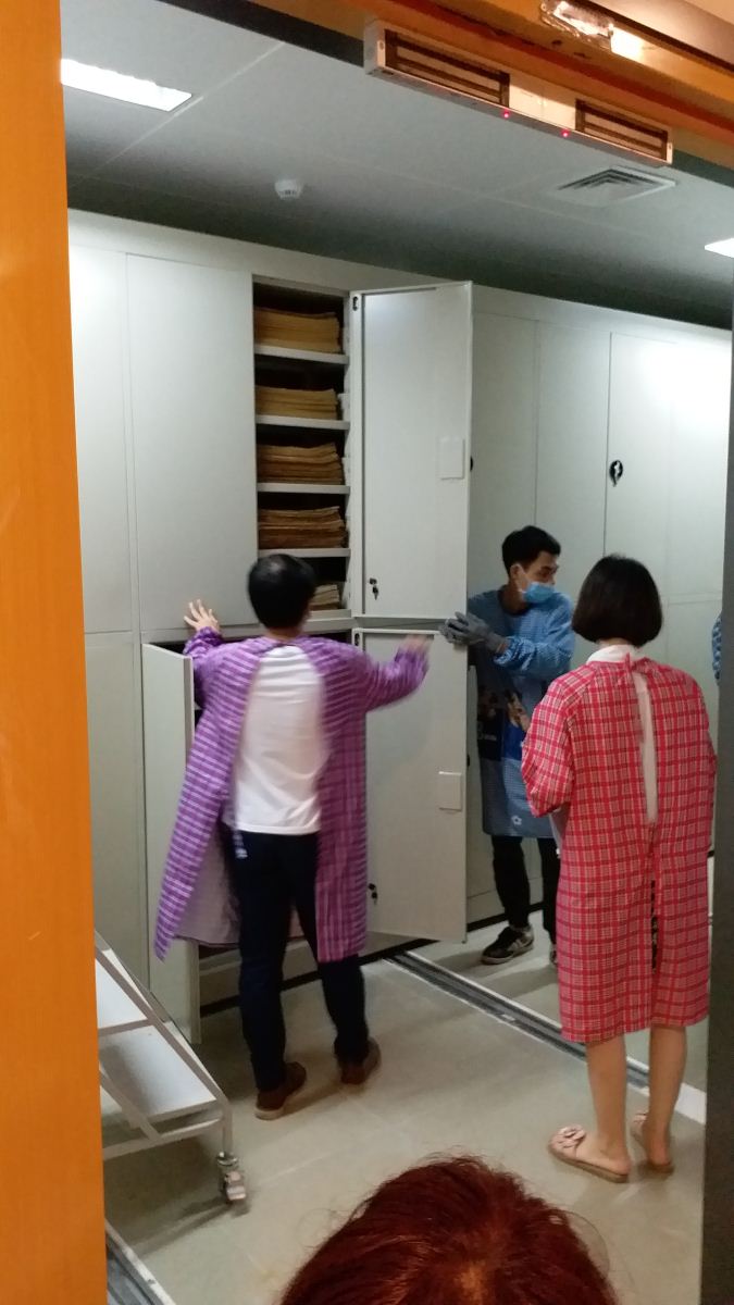 4月下旬,在借阅部刘建珍主任的组织下,新馆密集库工作紧锣密鼓地开展起来,由叶卫副主任及谭雪贞两位同志带领借阅部多位员工开始对剔旧书刊进行入库工作。密集库工作分成报纸入库、杂志入库和图书入库三个阶段。4月22日开始进行报纸入库,我馆只存放永久性收藏的报纸,按年份顺序上架,每一年不同的报纸再按索书号排序上架。本地报单独另外放。上好架后将每册报纸所在的架层做好定位录入系统。5月5日开始进行杂志入库,我馆只保存永久性收藏的杂志,确定架位后将数据导入系统。