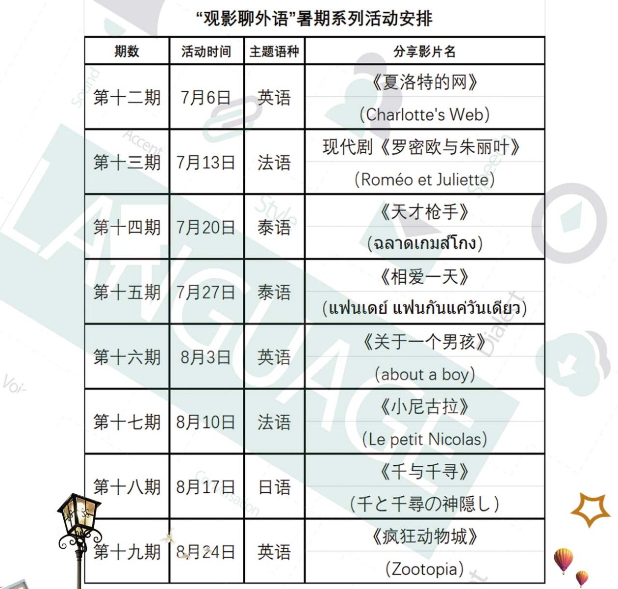 “观影聊外语”暑期系列活动通过对经典原声外语电影作品的赏析,运用电影艺术良好的教育形式,分享和交流外语及外国文化,不仅丰富了外语角的活动内涵,丰富了外语爱好者的学习内容,更丰富了对外语怀着浓厚兴趣的学生们的暑期文化生活,收到了参与读者的一致好评。