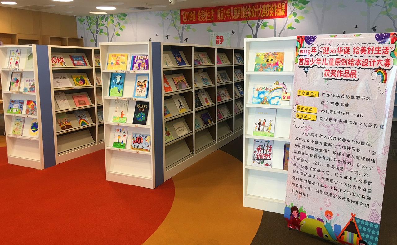 8月10日,市图书馆少儿阅览室举办的“迎70华诞 绘美好生活”首届少年儿童原创绘本设计大赛作品展开展当天迎来了众多小读者和市民朋友争相阅读,原创绘本将持续展出到本月15日。本次大赛自今年2月开始筹划,历经5个月的宣传、培训、作品收集、评选、公示,取得了圆满成功。透过一份份有趣有爱有创意的原创绘本作品,折射出孩子们五彩斑斓的童真世界,展现了壮乡少年儿童新时代精神风貌,共同祝愿祖国母亲70年华诞生日快乐!