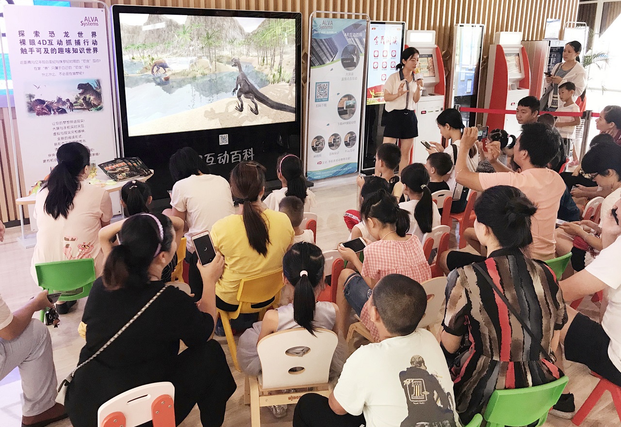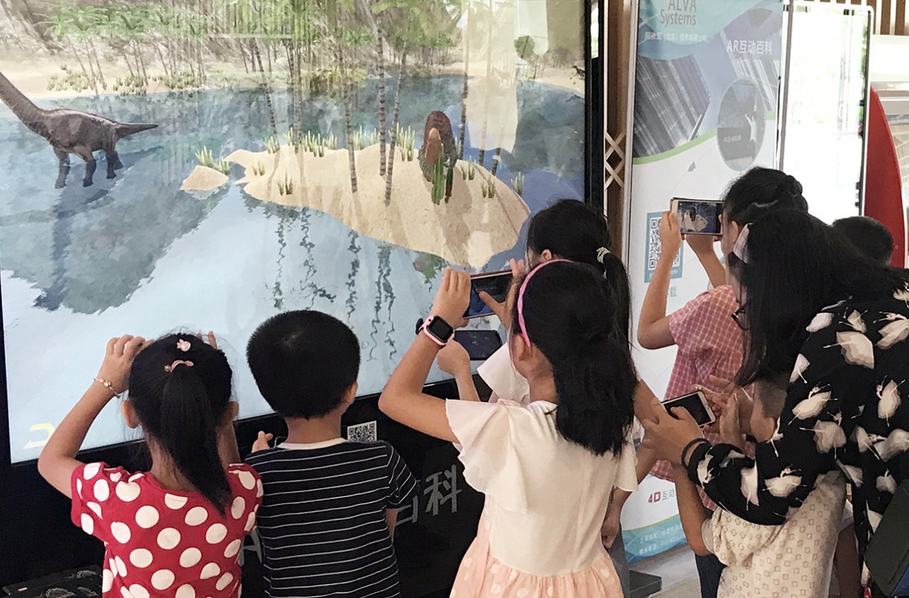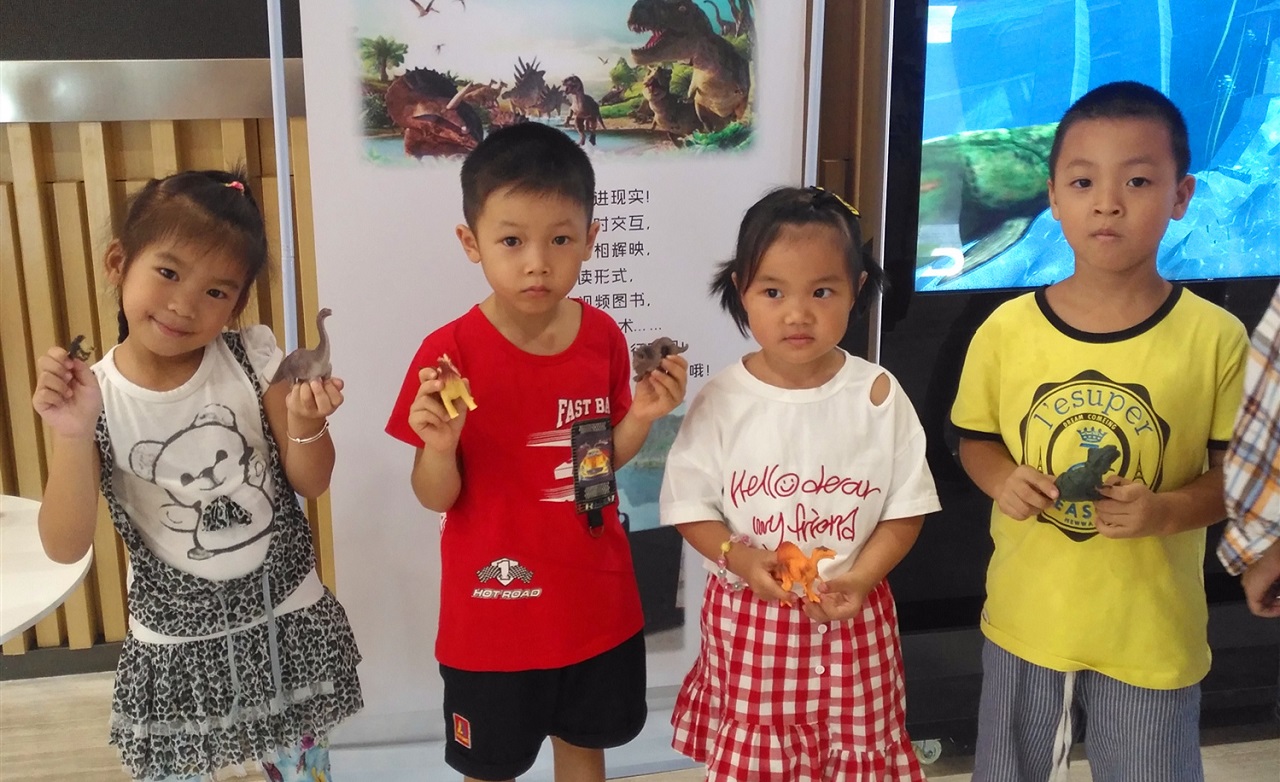 8月4日一早,南宁市图书馆服务大厅的一台全新的AR互动百科机器前聚集了不少家长和小朋友,“童阅森林”裸眼4D百科全书科普阅读体验活动就在这里拉开了帷幕。本次活动带领小朋友们一起进入恐龙时代,见识各种各样的恐龙。小朋友们利用事先下载好的AR互动百科APP,在AR显示屏中扫描自己喜欢的恐龙,就能够将恐龙“捕捉”到自己的手机屏幕中。通过放大,缩小,旋转等操作,小朋友们可以从360°全方位观察自己“捕捉”到的恐龙。小朋友们还可以通过阅读功能,查阅关于自己“捕捉”到的恐龙的详细资料,了解更多关于恐龙的知识。最神奇的是,通过AR互动百科的摄像功能,小朋友们能够把恐龙带到现实的场景中,与恐龙合影就不再是梦想了!这么神奇又有趣的百科,小朋友们都爱不释手,不断地在屏幕中“捕捉”各种各样的恐龙并与它们合影。拍摄技术比较高超的小朋友拍出的照片就跟真的在与恐龙玩耍一样。而这些“捕捉”到的恐龙都会被收藏在自己的AR互动百科中,回家之后也能随时打开阅读,十分便利。此外,活动现场还摆出了许多恐龙模型与一些与恐龙有关的书籍,虚拟与实物的结合,让小朋友们有了更丰富的体验。