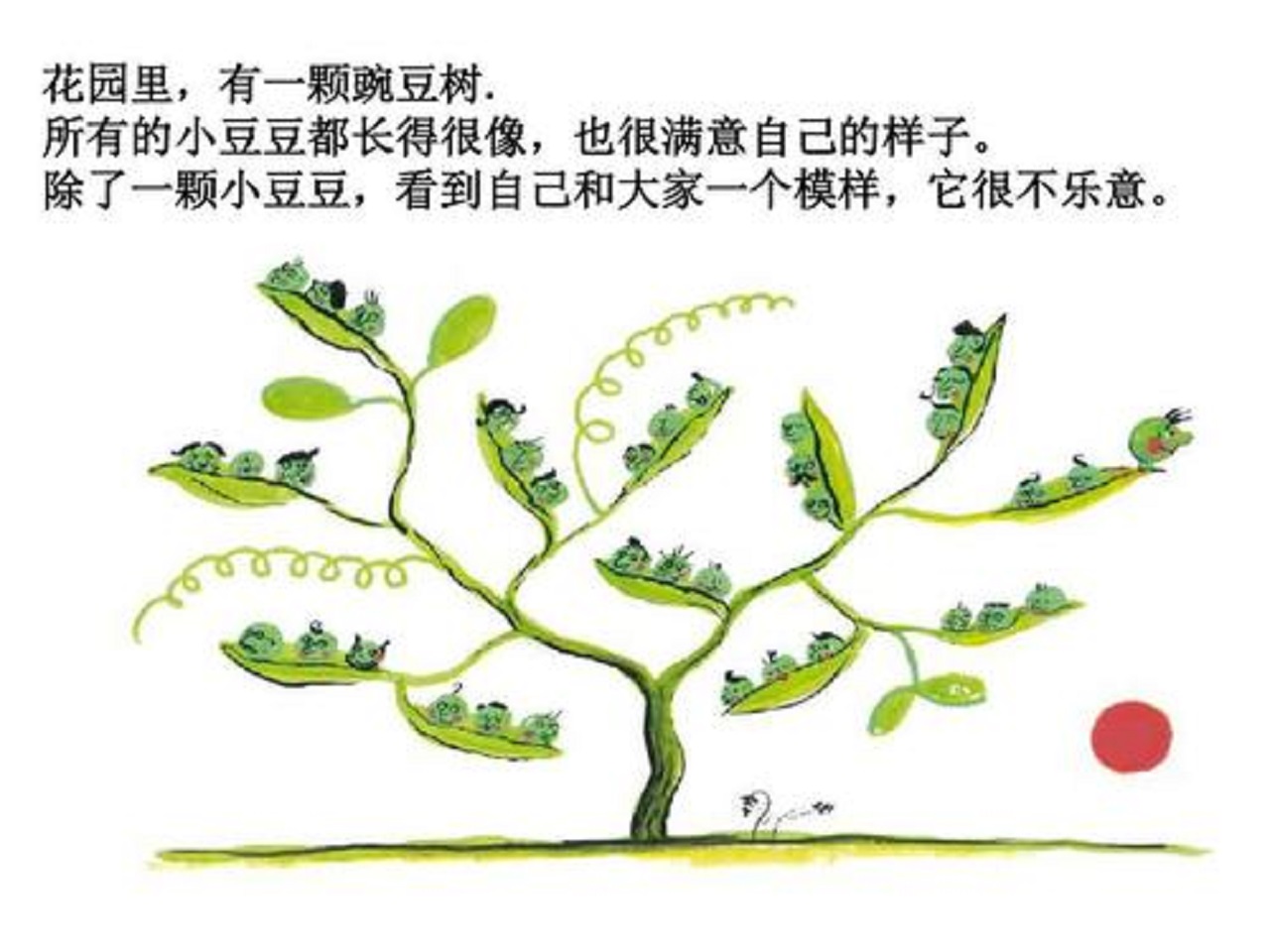 “有一颗小豆豆,和花园里豌豆树上所有的小豆豆都长得一样。只是它对自己不太满意,它跳出豆荚,遇见了孔雀,遇见了老虎,果然看到了不一样的世界……”