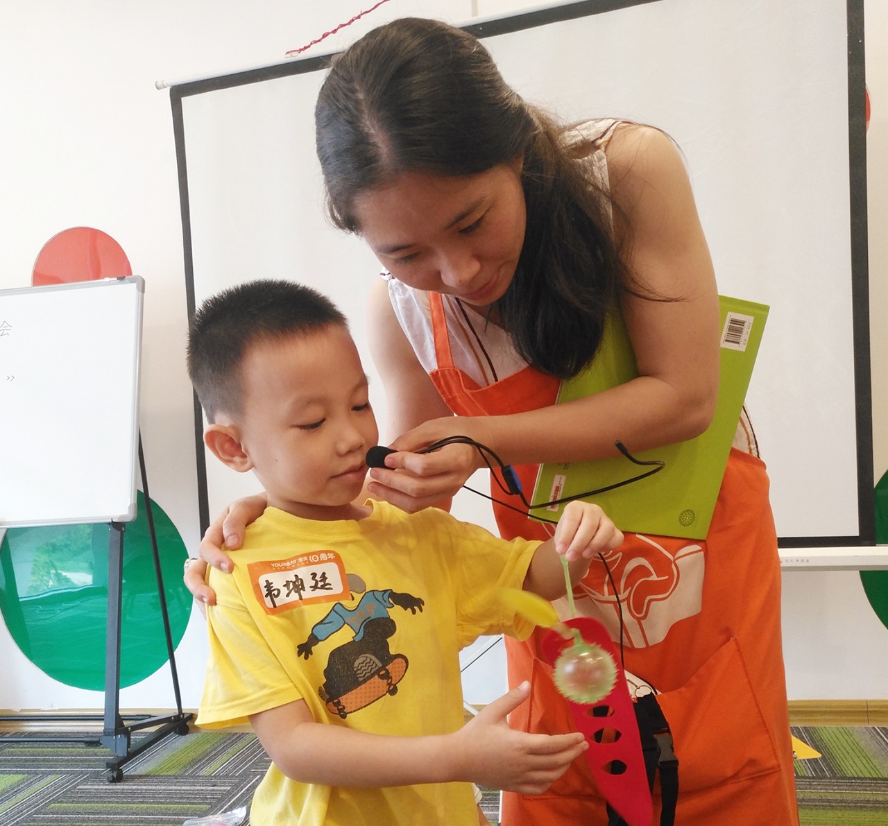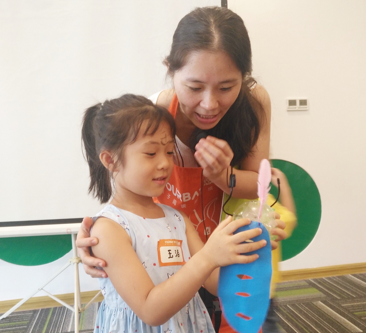 在第二环节,师生一起从声音、表情、动作和对话赏析经典绘本剧《钓鱼》,为接下来的绘本演绎打下基础。在表演环节,小演员们有的落落大方,有的自带剧中“老爷爷”的气场捏着白胡子,有的一遍不行马上又重新调整好语调和表情再来一次……一个现场版的《钓鱼》马上就有模有样了。最后,戏剧体验课在家长和孩子共同合作的信任游戏的欢声笑语中落幕。