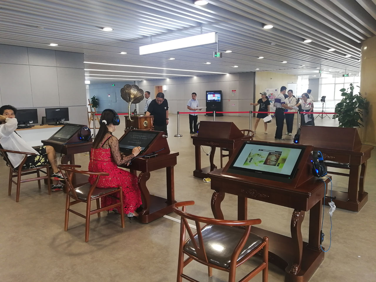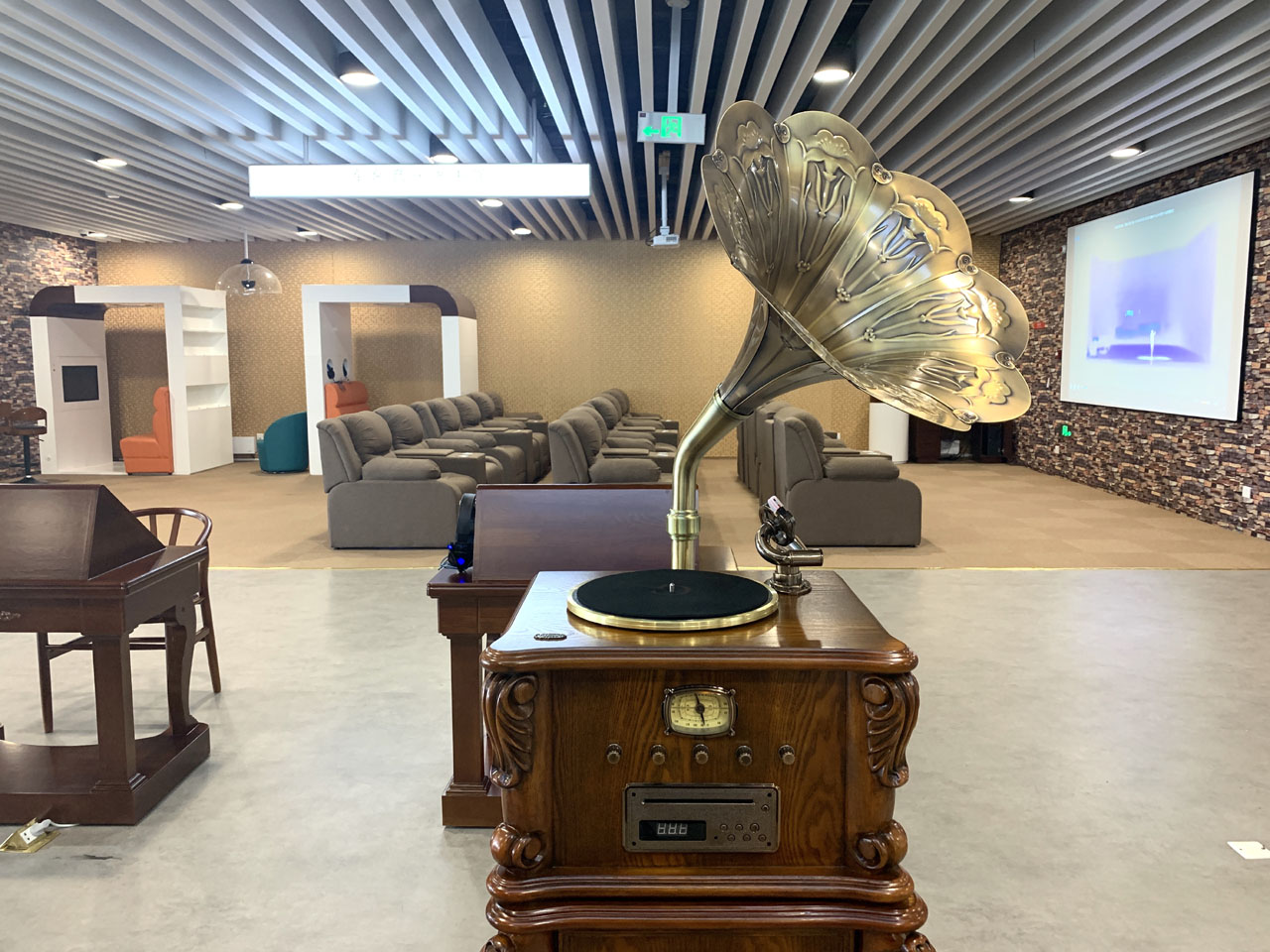在服务台前方放置了五套数字留声机和一套云智能古典留声机。古典留声机可播放黑胶唱片、CD等,同时支持收音机等播放。